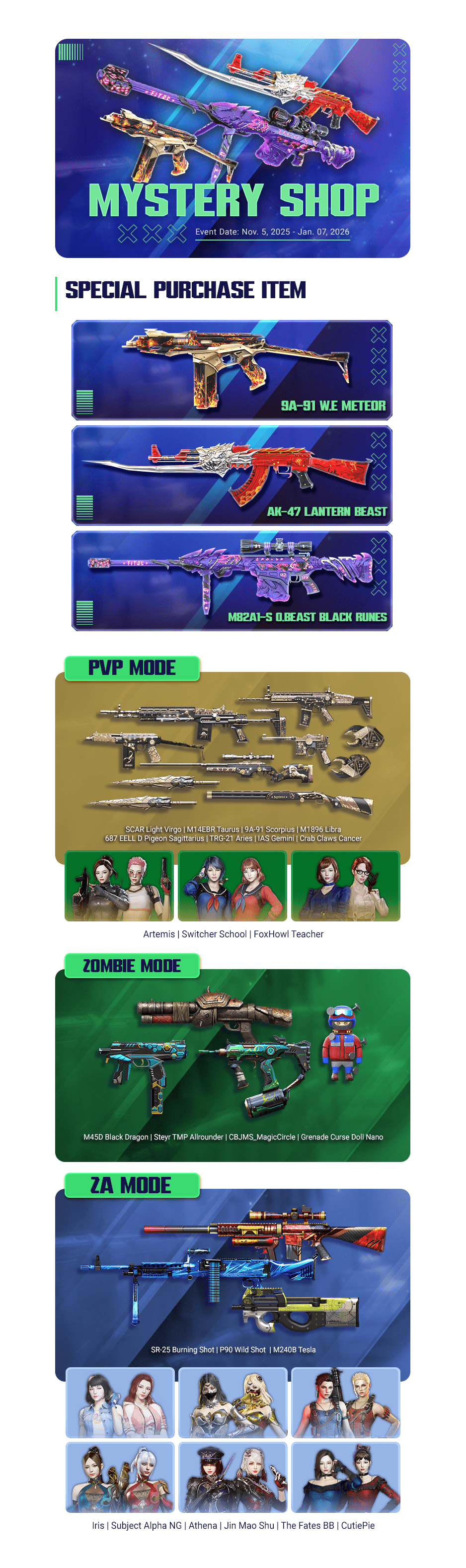 The Mystery Shop is a new feature where players can select from 3 categories: PVP, ZOMBIE, and ZA. Each slots are revealed when clicked, giving them random weapons from the categories.