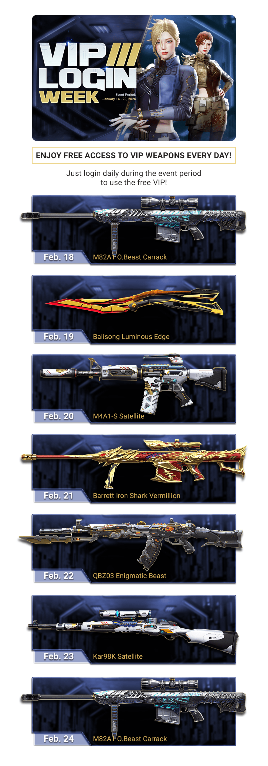 Free use of selected VIP weapons this week! Just login and play during the event period to use the free VIP weapon for a day!