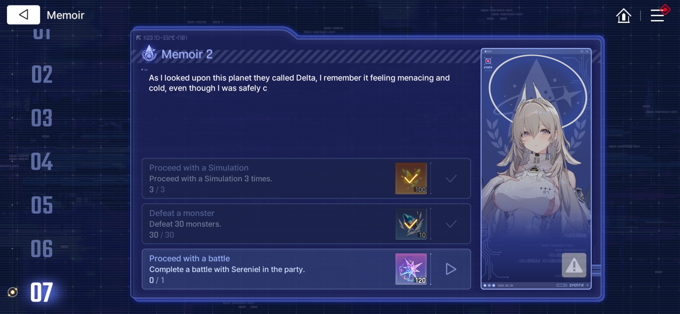 Memoir no.5 and no.7 have the mission to "Complete a battle with Sereniel in the Party" well I've been playing with Sereniel all day (Chaos, Battle mission, Simulation, etc).