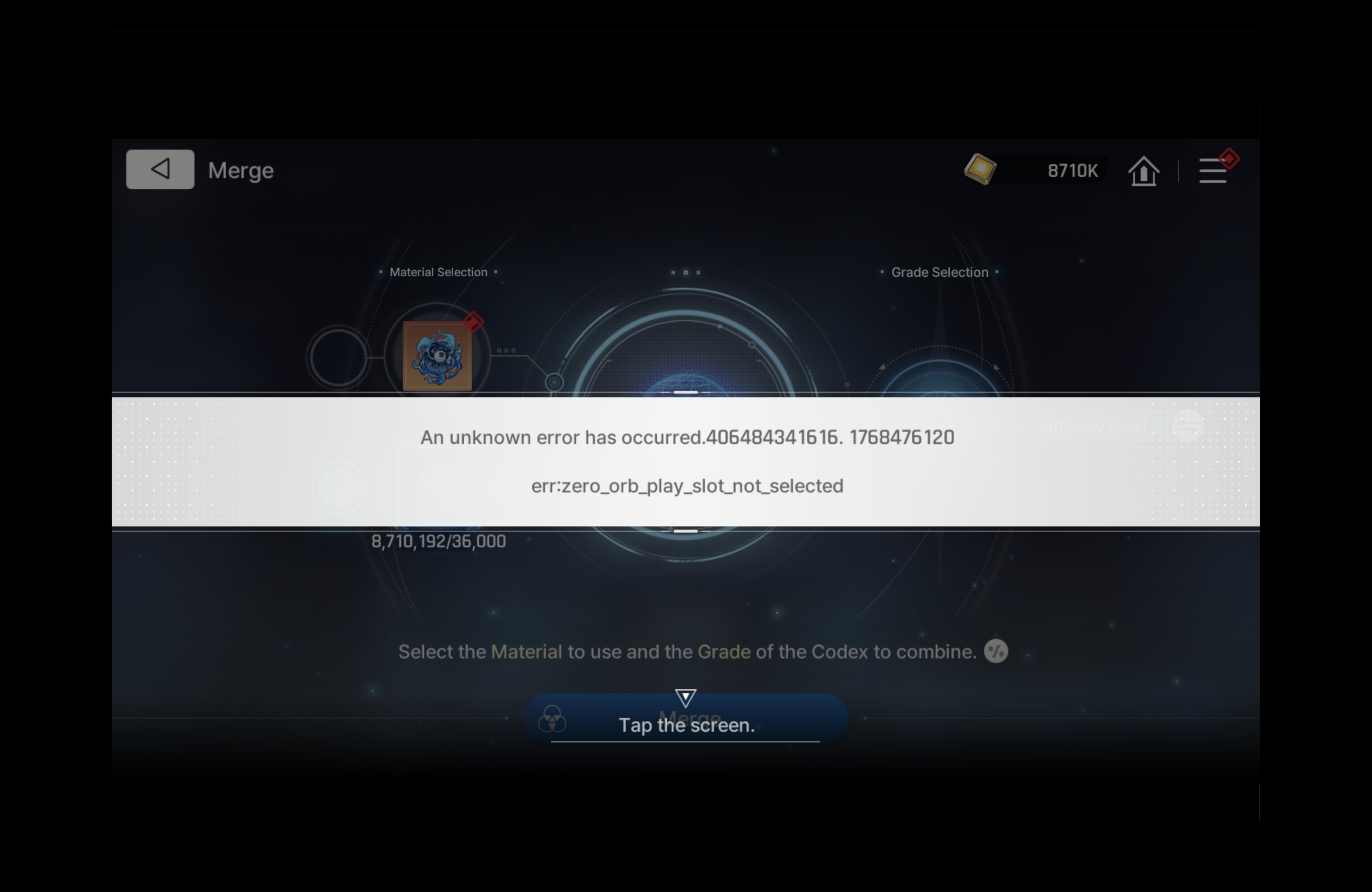 글상세Issues & Feedback Board Zero System merging issue (Jan 15, 2026) ItsLooka 15/01/2026 11:31 AM 15/01/2026 08:31 PM (+09:00) view count 276 View MY HOME View Posts Report Share Hello everyone!I have been having this issue since this morning whenever I try to merge a new Codex in the Zero System.Any ideas if I'm the only one having this issue or are the devs actually aware of this? Reply 0 alarm Notification has been disabled. Newest Newest By registration By recommendation To enter a comment Log In Please Confirm Cancel Confirm