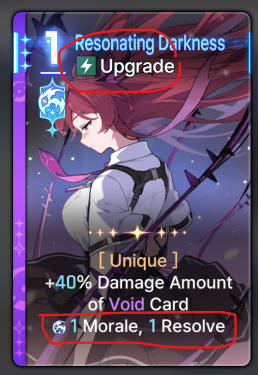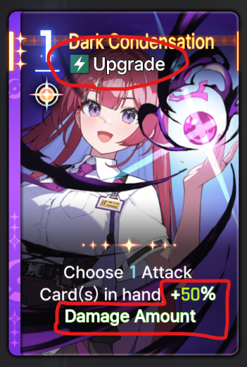 You could say It's my fault for not reading it properly, but either way it would still be better if they put the actual upgrade on top as it is the main "feature" of the card. Differentiating the font color like amir's card (1 time bonus white, upgrade green) would also be nice. I know the concept of "at the start of turn" and "+x%" is different, but what I'm trying to emphasize here is to differentiate between an upgrade buff and bonus buff.