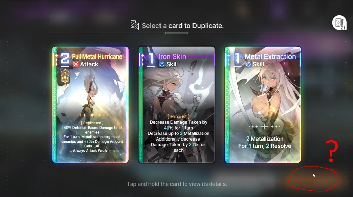 I'm unsure if this is an intended feature or a bug, but when you have this upgrade which allows you to choose which character you'd like to try and duplicate a card from, you will be unable to skip the selection if you don't like the options.