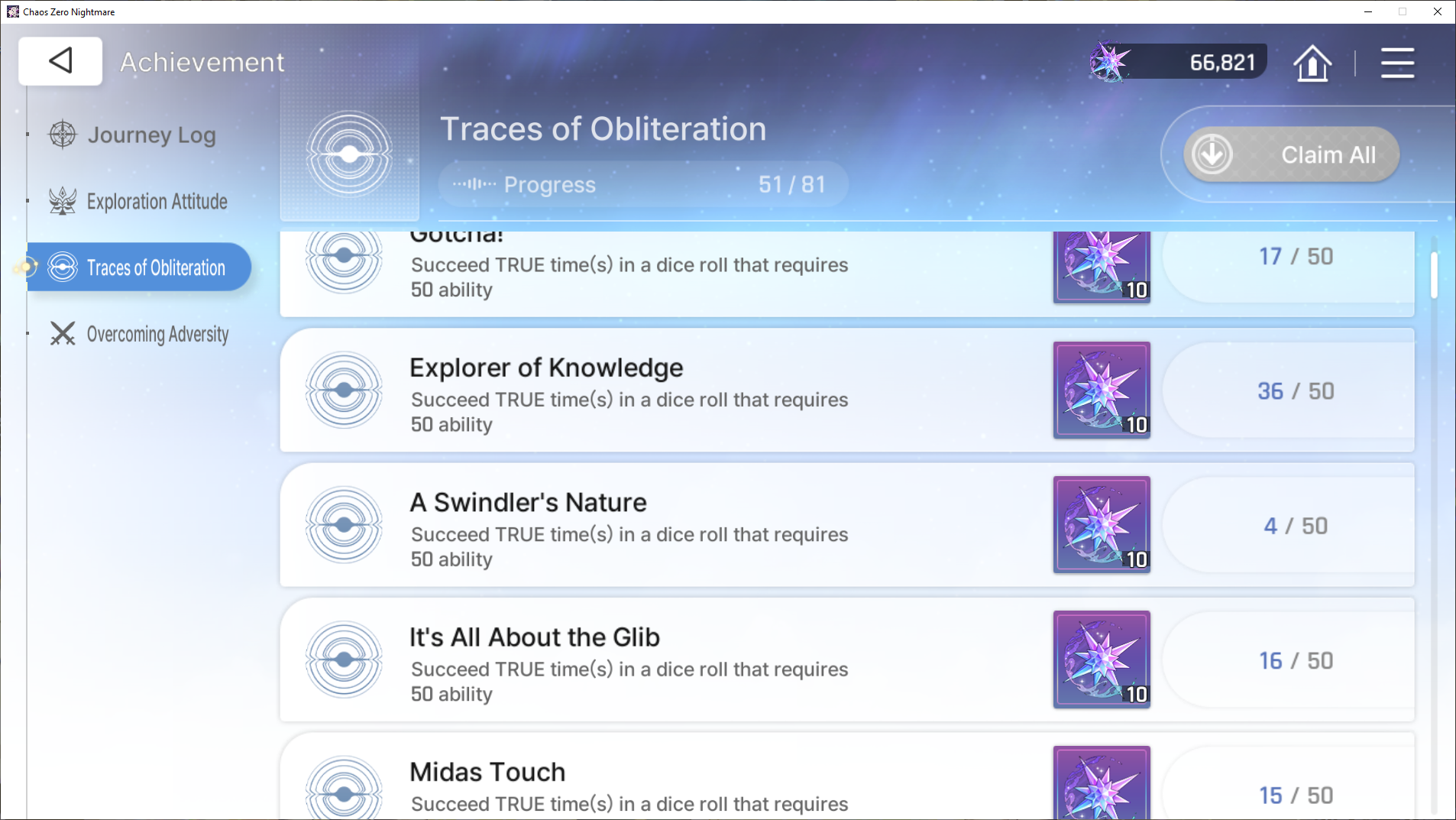 My assumption would therefore be that you need to roll a natural 20, 50 times on a dice roll.