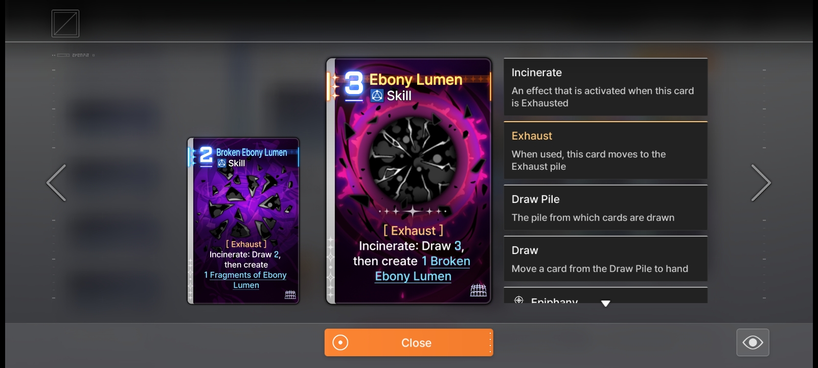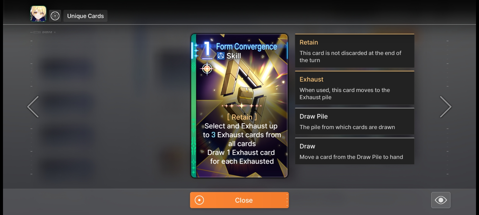 Form Convergence: 1 cost, exhaust up to 3 cards, and draw the same amount of exhausted cards, it SEEMS weak, or costly, but the semi-universal exhaust already justify this card, for this deck, we're not playing divines, but we do have ebony lumen, this makes this card a 1-cost, draw 3/ 2/ 1, while helping you filter your deck from archetypes that may have infiltrated, or get rid of debuffs cards your enemies may put on your deck, while also having great synergy with [incineration] cards, and giving you the hability to level UP your [Hew] or exhaust some [Futility], its a great card to have at your disposal, and the 'retain' effect make it so It can just chill in your hand untill you think its the best time to use;