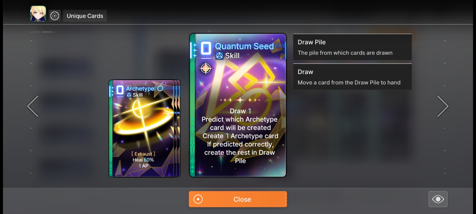 Quantum Seed: 0 cost, draw 1, and create a random archetype on your hand, thats important, cause you dont want your archetypes to flood your decks and reduce your draw vallue, and, when predicting correctly, you create another archetype on your deck; this card is pretty straightforward, as said, the trick here is always predict on Square, why ? simple, If you get It wrong, you either create a circle ( +1AP ) or a triangle ( x30% DMG ) and you still getting the free draw ( thats a similar vallue of a source of water with draw 1 ), and, If you get it right, you guessed for square, and what It does ? It draws you the archetype youve created ( If you guess Circle for example, and you get It right, itll create another archetype on your deck, possibly being a Square, wich is the worst one to have out of your hand )