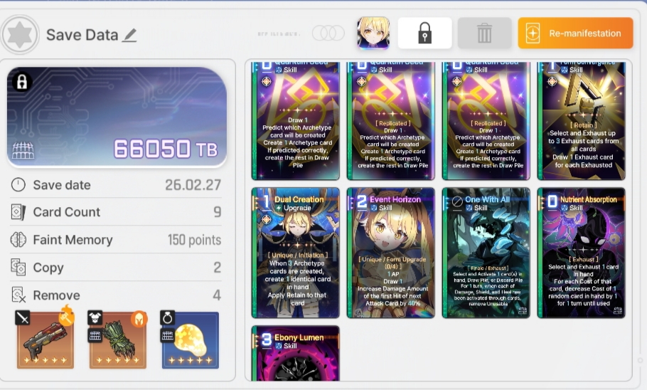 !!Nutrient Absorption!!: Thats another card you'll only take If you like It, its not a must, but when playing Nine, this allow you to level UP a Hew and, with some luck, make It a 0-cost (itll reduce the cost of one random card in hand by the cost of the exhausted card, so, when exhausting a Hew, the new one can be created as a 0-cost ), dont underestimate possible epiphanies too, things like Draw 1/Draw 1 next turn, 1AP, or +Ego Points, are quite valuable, and this card is also a good engine for Ebony Lumen, or to make Event Horizon a lot more usefull ( for example, make It a 0-cost, 2AP, Draw 2, +120% DMG ), i really recomend you to get at least one;