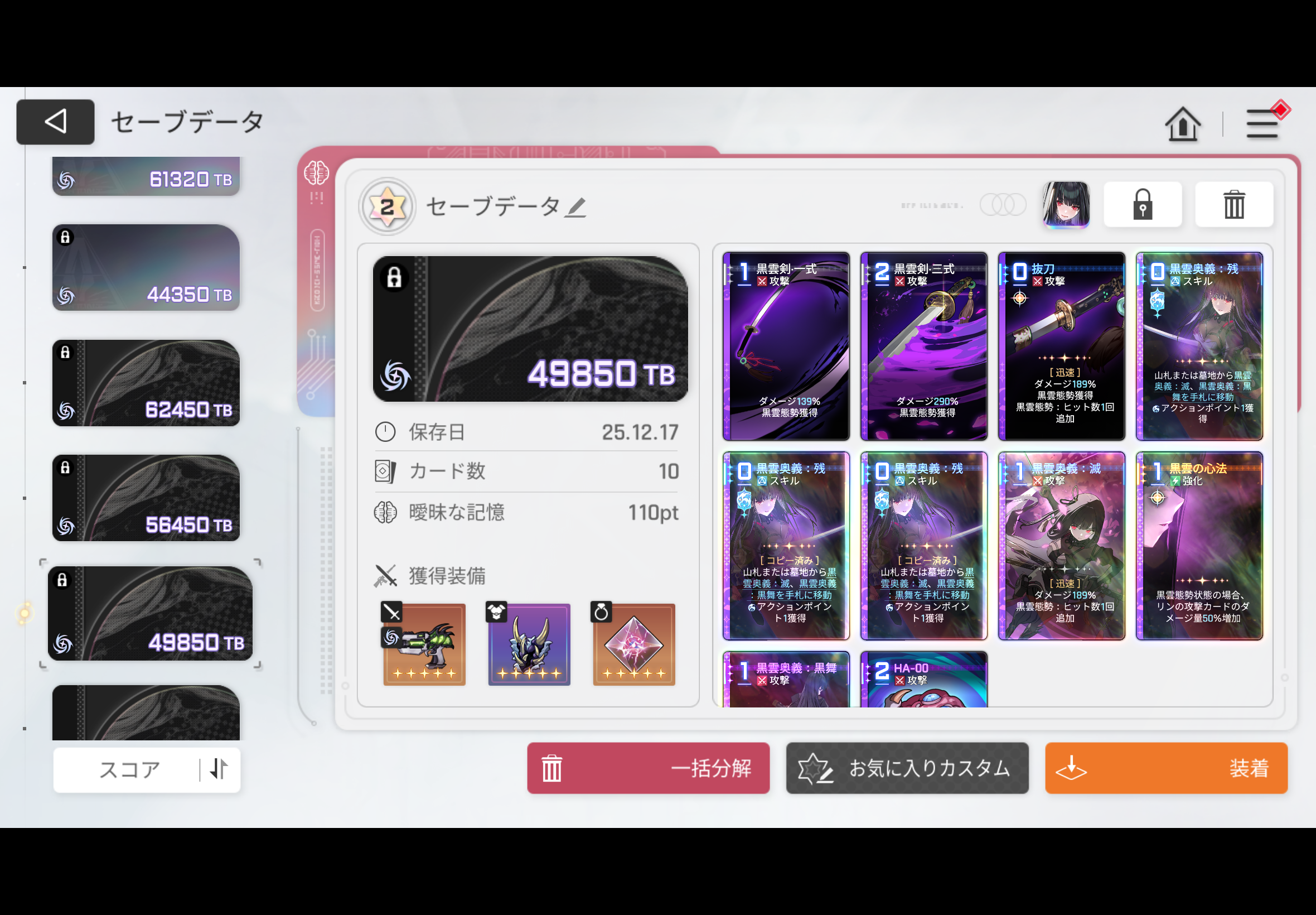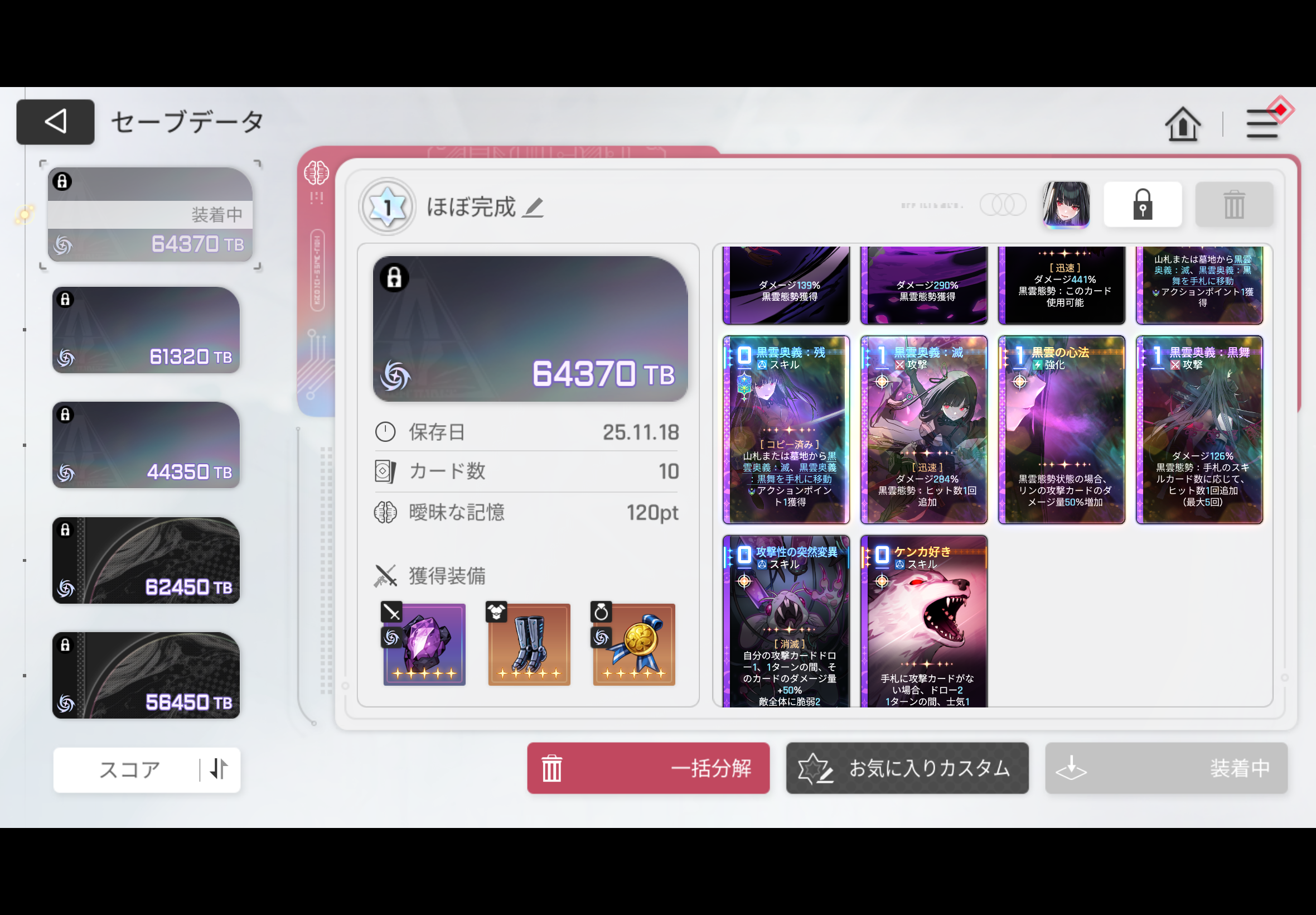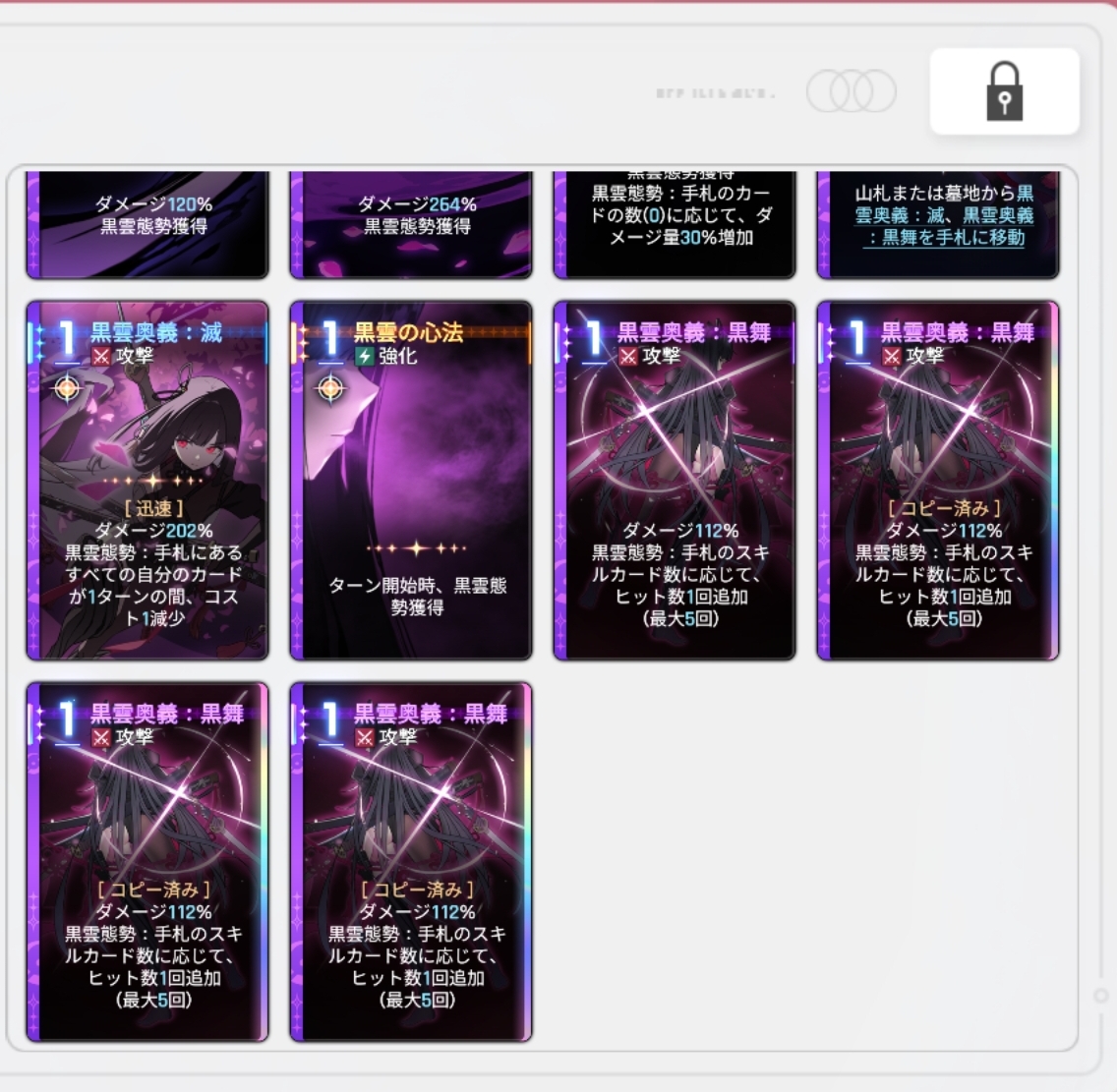 黒雲奥義残に滅と黒舞手札移動のヒラメキ+AP1と、黒雲心法の50%増加ヒラメキの複数コピー、滅とかその他のまともなヒラメキを狙ってましたが全然揃わなかったです…シーズン2になったらもっと楽に揃うんでしょうけど、頑張った証としてここに供養させて下さい🙏