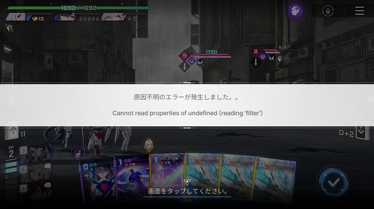 글상세不具合の報告 ヒラメキ選択後エラーメッセージが表示され進行不能になる [1] S1761875489602112 2026-02-06 05:01 2026-02-06 14:01 (+09:00) view count 57 MYホームを見る 作成した投稿/コメントを表示 通報する シェアする カオス中、無限ループに陥り進行できなくなりました。①ヒラメキを選択②エラーメッセージが表示され①に戻る原因不明のエラーが発生しました。。Cannot read properties of undefined (reading 'filter') コメント 1 alarm 通知を解除しました。 新しい順 新しい順 登録順 おすすめ順 コメントを入力するには ログイン してください。 S1761875489602112 作成者 2026-02-06 05:03 2026-02-06 14:03 (+09:00) MYホームを見る 作成した投稿/コメントを表示 通報 ゲームを再起動することで解決しました。 確認 キャンセル 確認