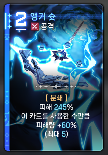 하루의 앵커슛은 예열이 끝난 상황에서 770%라는 압도적인 데미지를 자랑하고 딜 시너지를 터트리는 자체 버프 카드들로 명함 기준 1500%에 육박하는 똥파워를 뽐낸다.