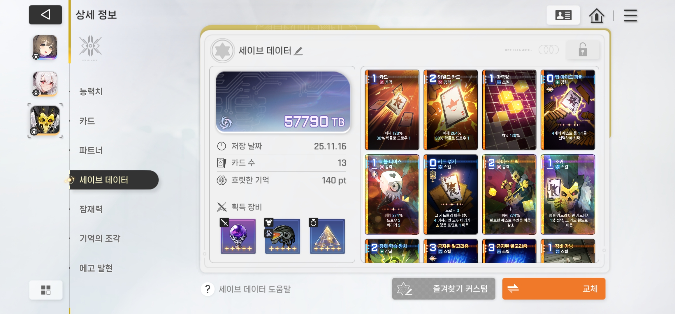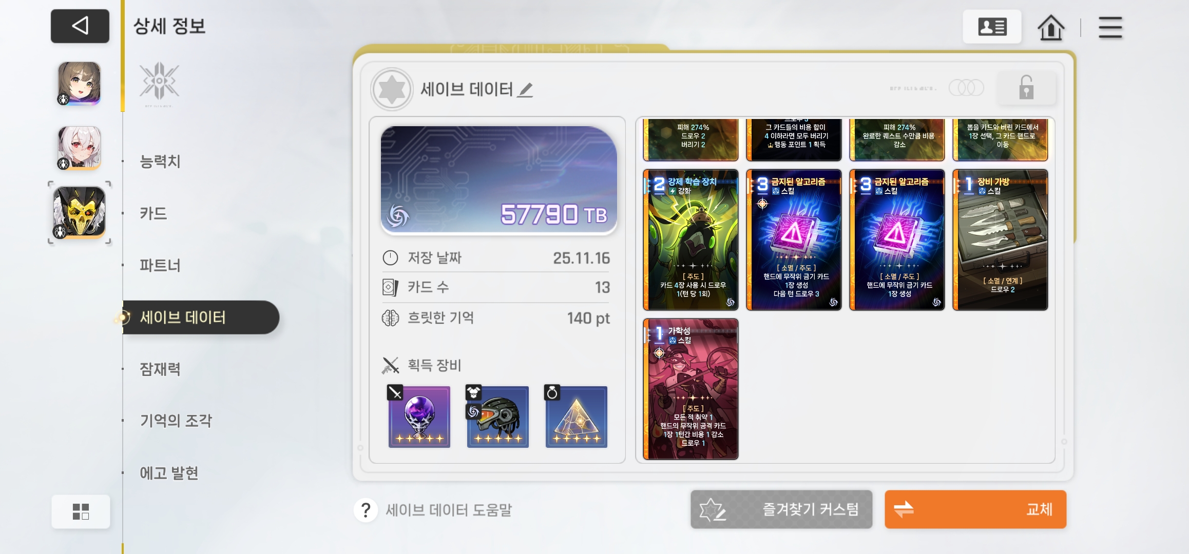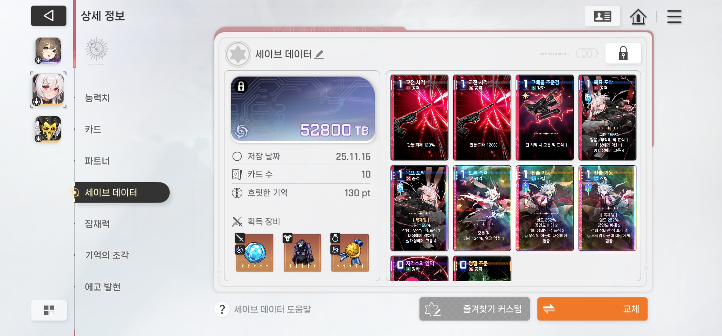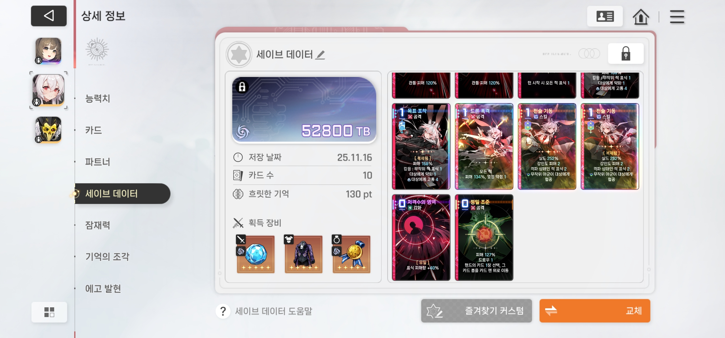 스펙은 아래 스크린샷 참고해주세요 드로우에 모든걸 바친덱입니다 맞고 다시 드로우로 피채우는 덱입니다(실드도 찹니다 아이템효과) 주도로 코스트가 높은(업데이트 이후로 금기 쓰기 편해졌으니 해보시는걸 추천 다른요원 주도는 안되니 한케릭에 몰빵하시면 됩니다) 표식으로 딜 mvp 엄청 꾸준히 딜 넣는게 아주 좋은 케릭이였습니다0돌이라 슬프네요 마리벨의 기억의 조각을 그대로 줬습니다 방어력이 체력도 올려주기 때문에 댓글 보고 파트너 현재 상황올릴게요 패가 안좋으면 질수 있으니 여러번 도전하시길 한번만 깨면 되니까요^^