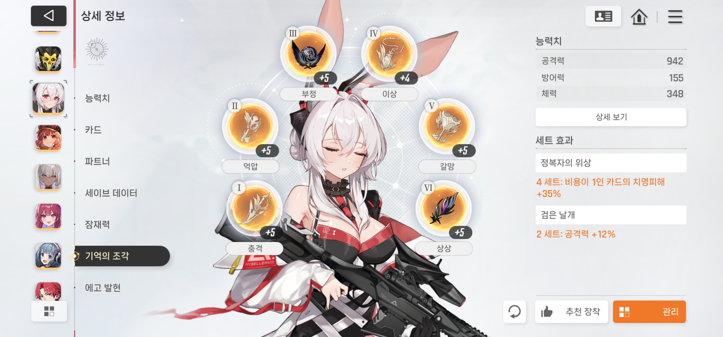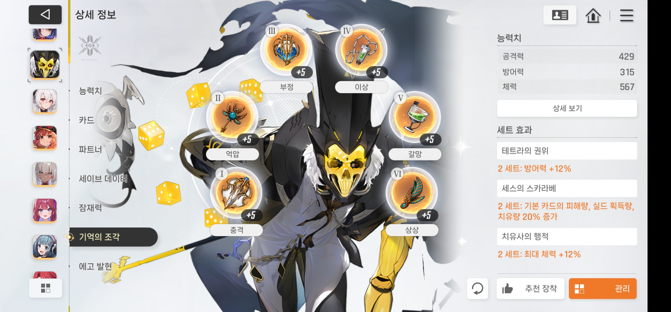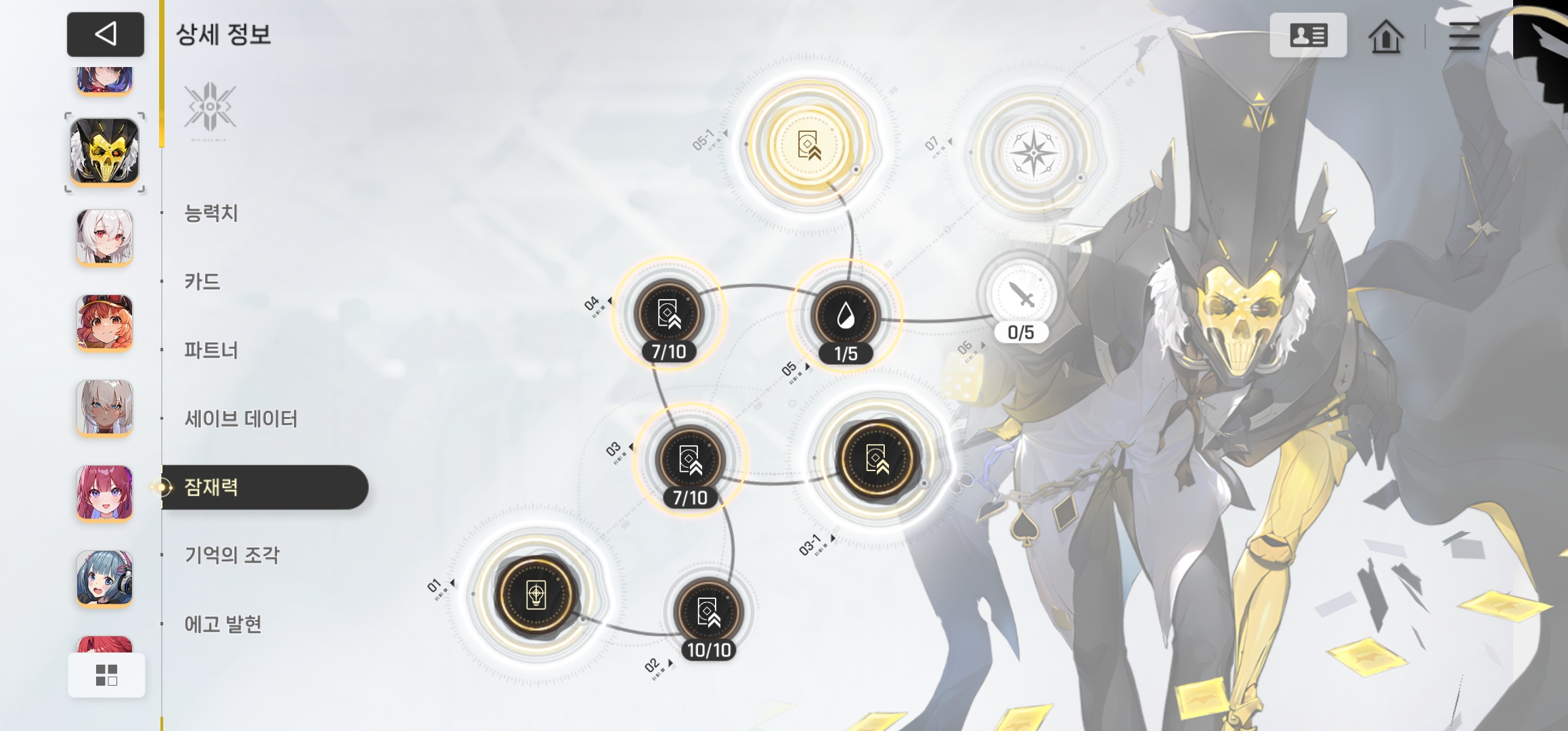 스펙은 아래 스크린샷 참고해주세요 드로우에 모든걸 바친덱입니다 맞고 다시 드로우로 피채우는 덱입니다(실드도 찹니다 아이템효과) 주도로 코스트가 높은(업데이트 이후로 금기 쓰기 편해졌으니 해보시는걸 추천 다른요원 주도는 안되니 한케릭에 몰빵하시면 됩니다) 표식으로 딜 mvp 엄청 꾸준히 딜 넣는게 아주 좋은 케릭이였습니다0돌이라 슬프네요 마리벨의 기억의 조각을 그대로 줬습니다 방어력이 체력도 올려주기 때문에 댓글 보고 파트너 현재 상황올릴게요 패가 안좋으면 질수 있으니 여러번 도전하시길 한번만 깨면 되니까요^^