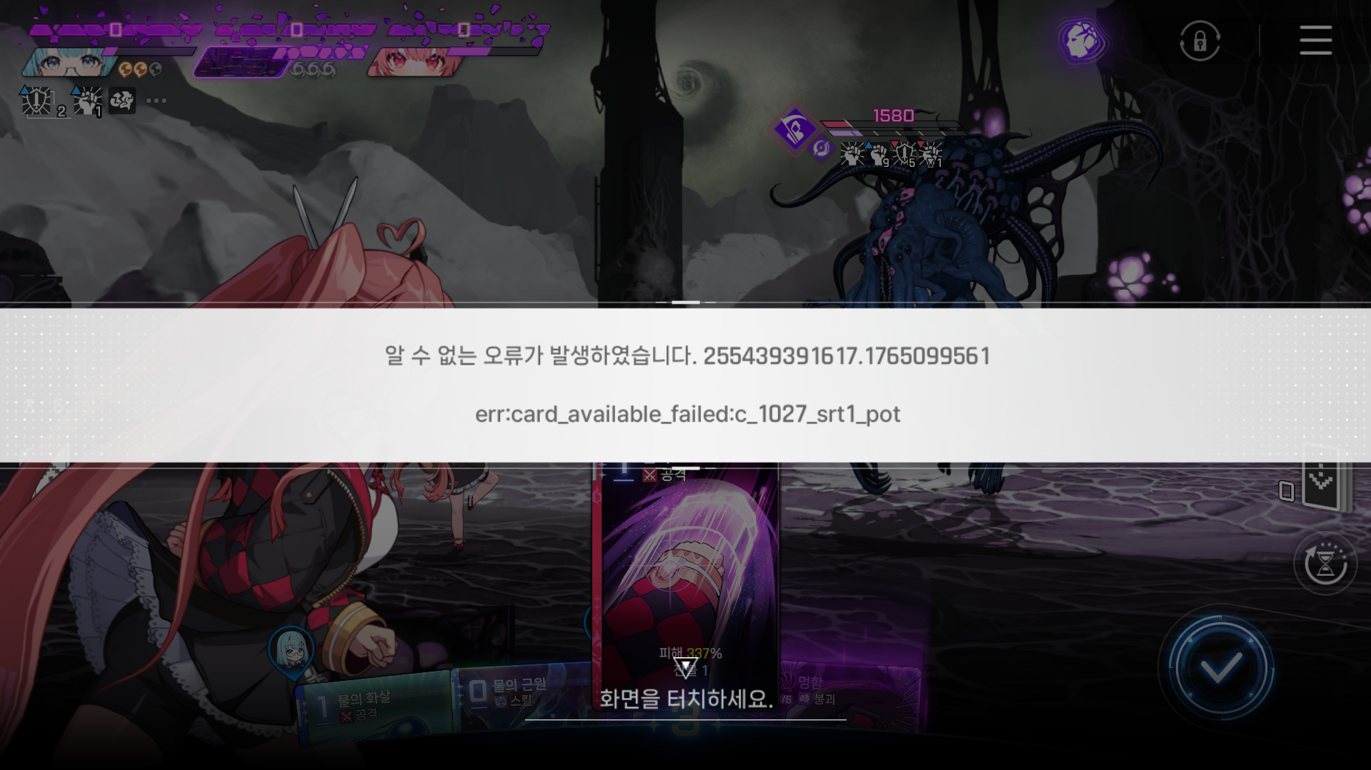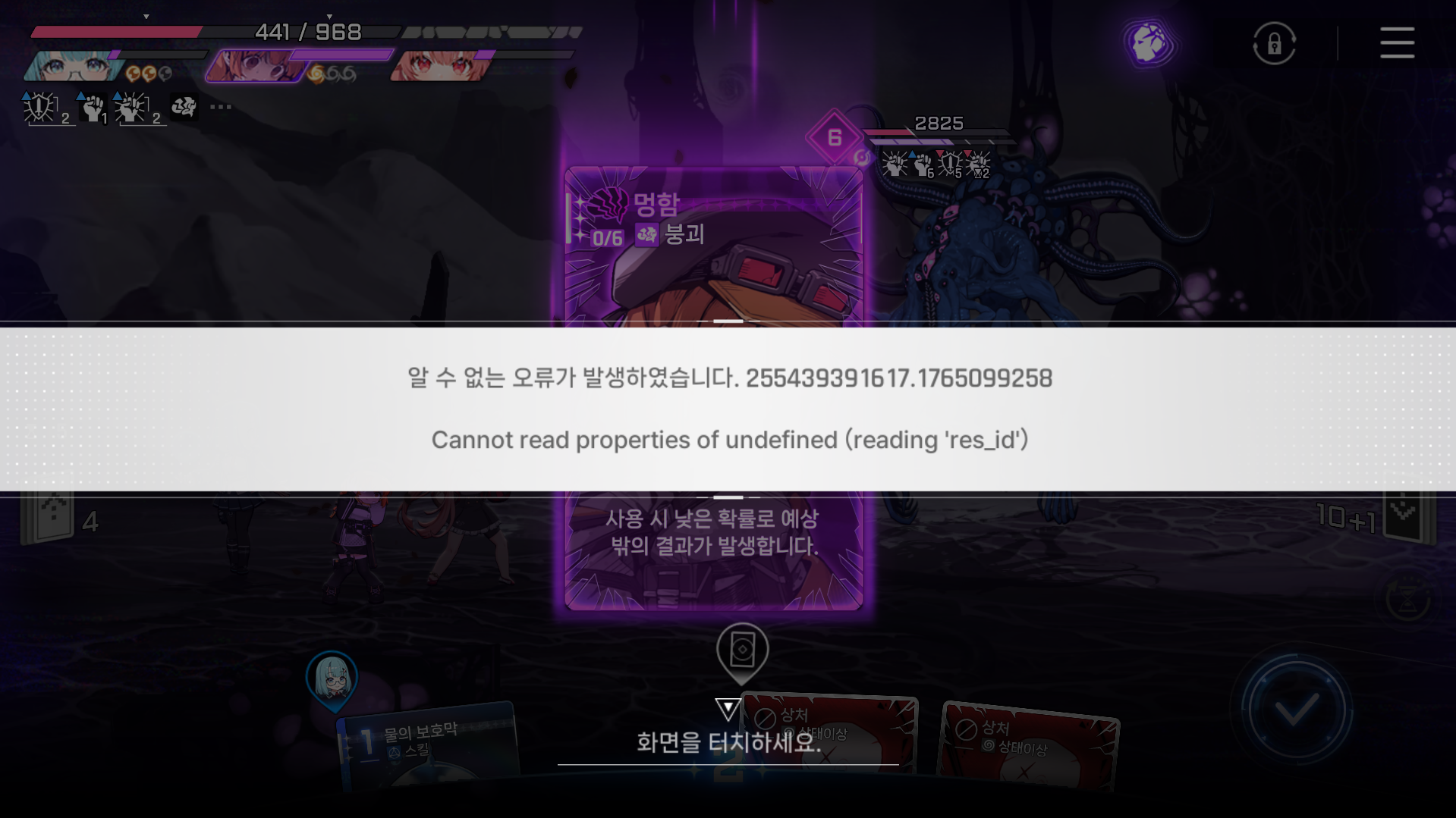 붕괴 탈출 -> 체력이랑 스트레스 안정권이였는데 공격 받은 후 똑같은 캐릭터 바로 붕괴 -> 에러 팝업 -> 재접 후 진행해도 에러 계속 발생