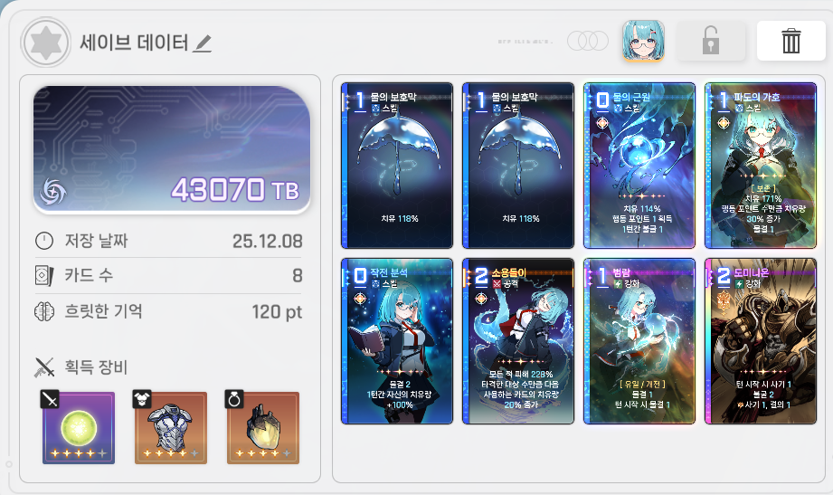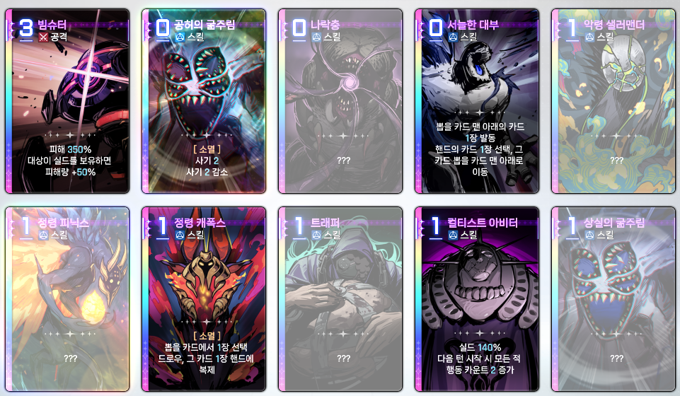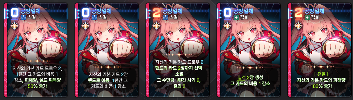 이 모든 카드가 다 쓰레기라는 소리입니다. 다양성? 줫박았죠. 저거 쓸바에 캐릭터 카드 1장이라도 더 쓰는게 이득이고 딜을 더 넣을 수 있습니다.