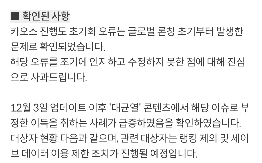 글상세자유 게시판 사실 저공지에서 눈여겨봐야 되는거 [3] S1763057078153812 2025-12-16 10:08 2025-12-16 19:08 (+09:00) view count 274 MY홈 보기 작성글 보기 신고하기 공유하기 사실 론칭 초기부터 있던건데 불나니까 고치는거 댓글 3 alarm 알림이 해제되었습니다. 최신순 최신순 등록순 추천순 댓글을 입력하려면 로그인 해주세요. s13726382216252 2026-01-01 06:02 2026-01-01 15:02 (+09:00) MY홈 보기 작성글 보기 신고하기 용의주도면밀 2025-12-16 11:33 2025-12-16 20:33 (+09:00) MY홈 보기 작성글 보기 신고하기 ㅊㅊ 스토리안봄 2025-12-16 10:10 2025-12-16 19:10 (+09:00) MY홈 보기 작성글 보기 신고하기 코덱스오류라 그럴거같긴했음시즌전부터 쓸사람은 쓰고 했을거고보면 재화가 남아돌아서 저렇게 깍을수있나 싶은사람 많았음 확인 취소 확인