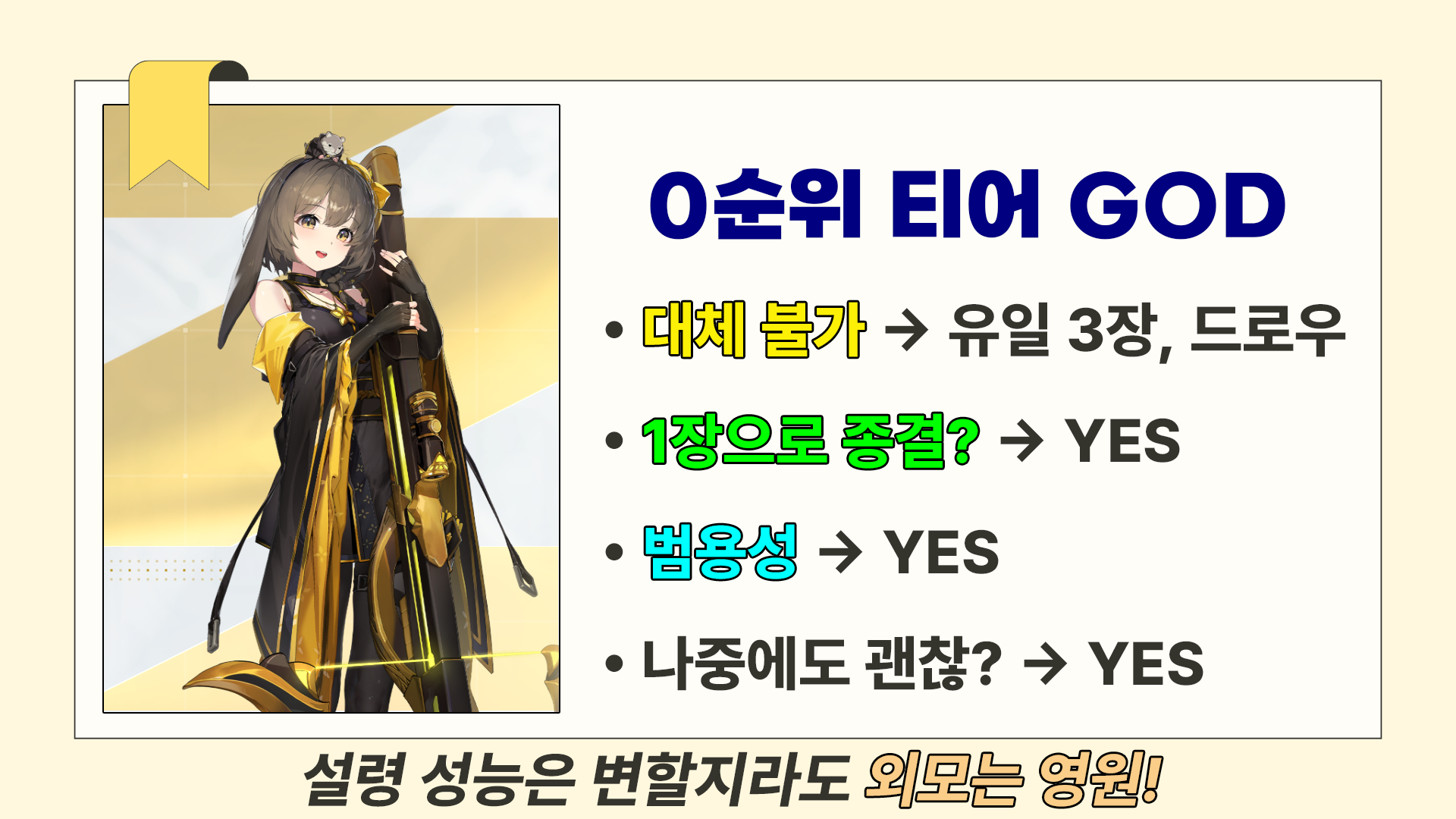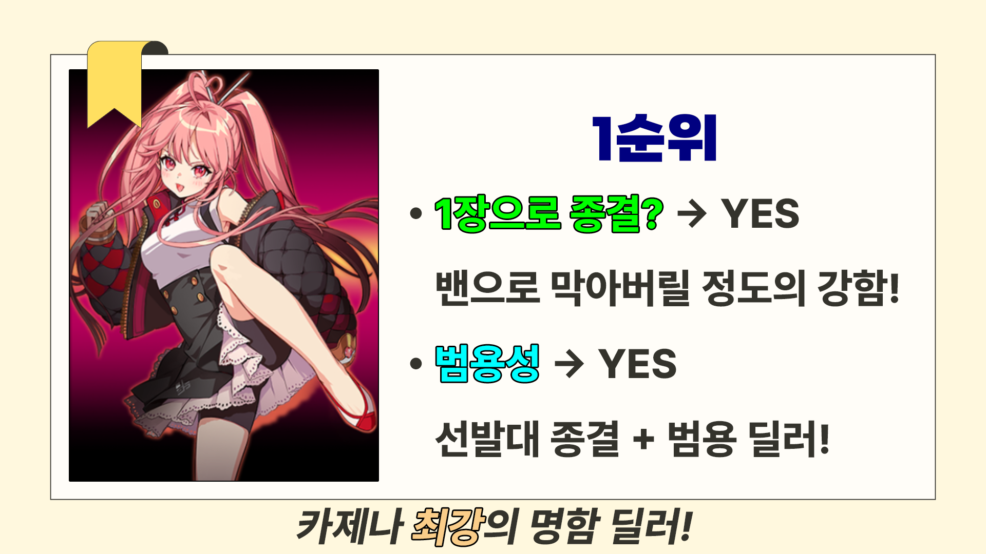 명함만으로도 사실상 종결이고, 범용성도 최고라 베로니카+서포터+딜러 조합이면 최소 준종결 덱은 바로 완성됩니다.