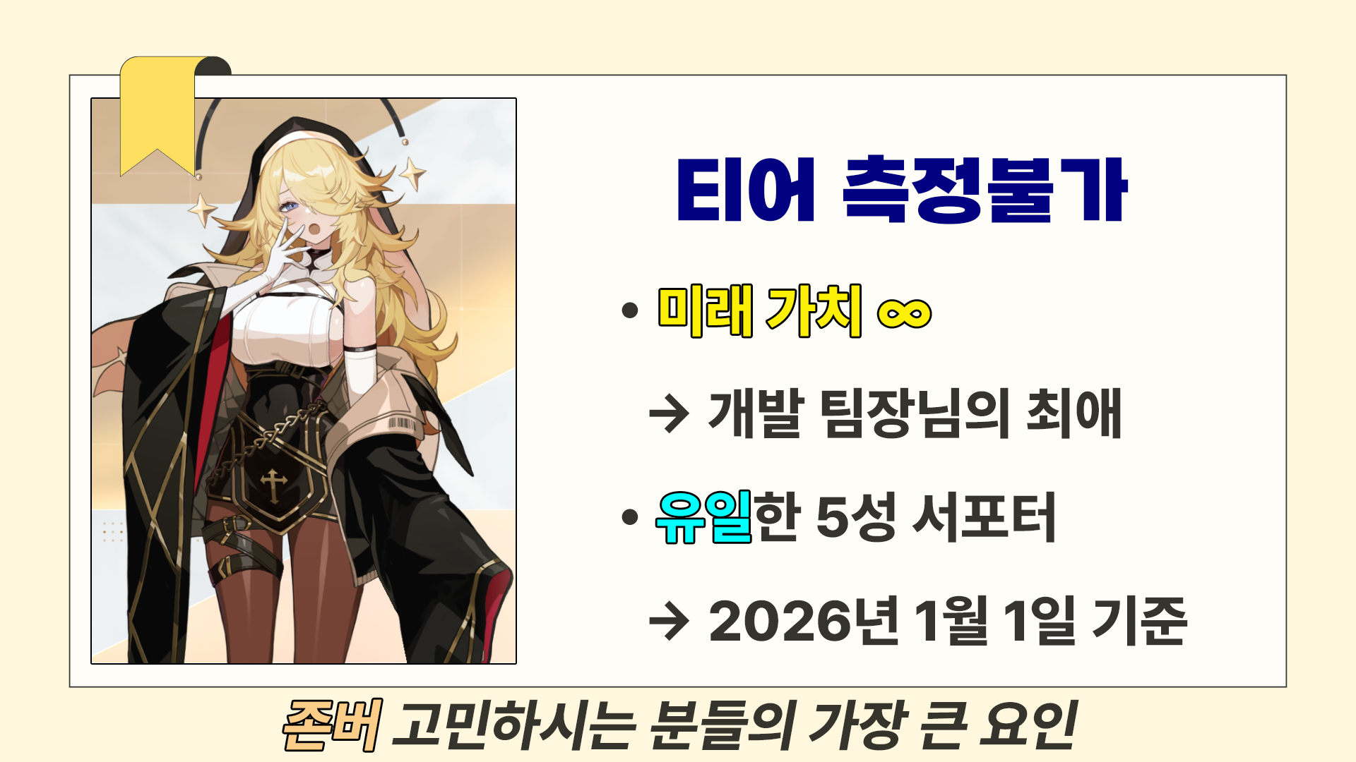 유일한 5성 서포터라는 상징성에도 불구하고 현재 4성보다 안 쓰이고 있어요.
