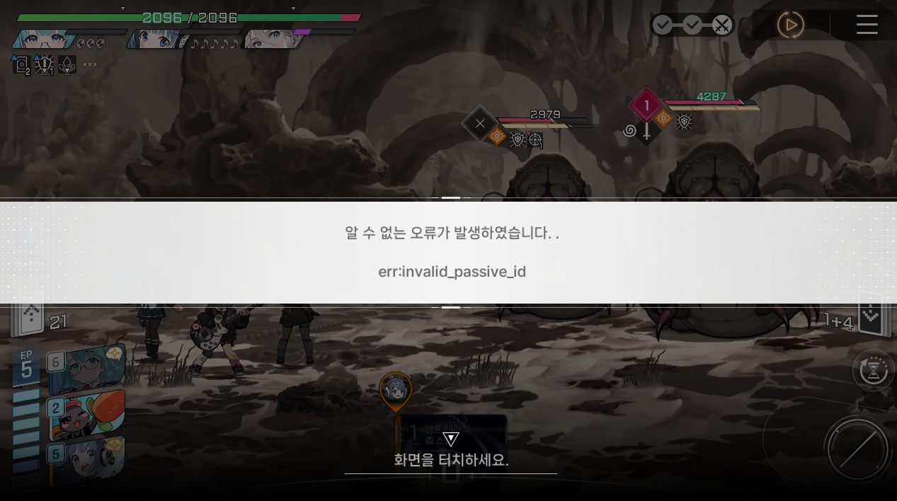 글상세제보/건의사항 금기의 카탈리스트 스토리 스테이지 진행 불가 오류 90309989 2026-01-07 08:42 2026-01-07 17:42 (+09:00) view count 80 MY홈 보기 작성글 보기 신고하기 공유하기 이벤트 스테이지 3장 B09 진행 중 아래와 같은 에러메시지가 반복적으로 나타나며 턴 종료가 불가합니다.게임 재실행 시 진행한 부분부터 이어하지 않고 진행 내용이 소실됩니다. 댓글 0 alarm 알림이 해제되었습니다. 최신순 최신순 등록순 추천순 댓글을 입력하려면 로그인 해주세요. 확인 취소 확인
