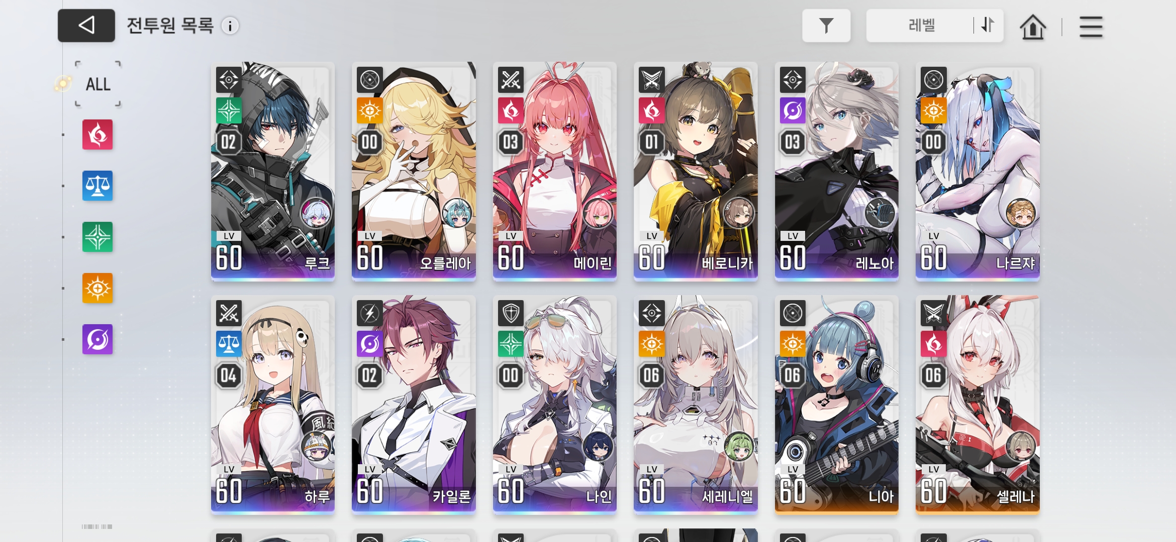 한눈에 알겠지, 5성 캐릭터가 맨 위에 오고 그 다음은 레벨 높은 순서대로 정렬되는 거야.
