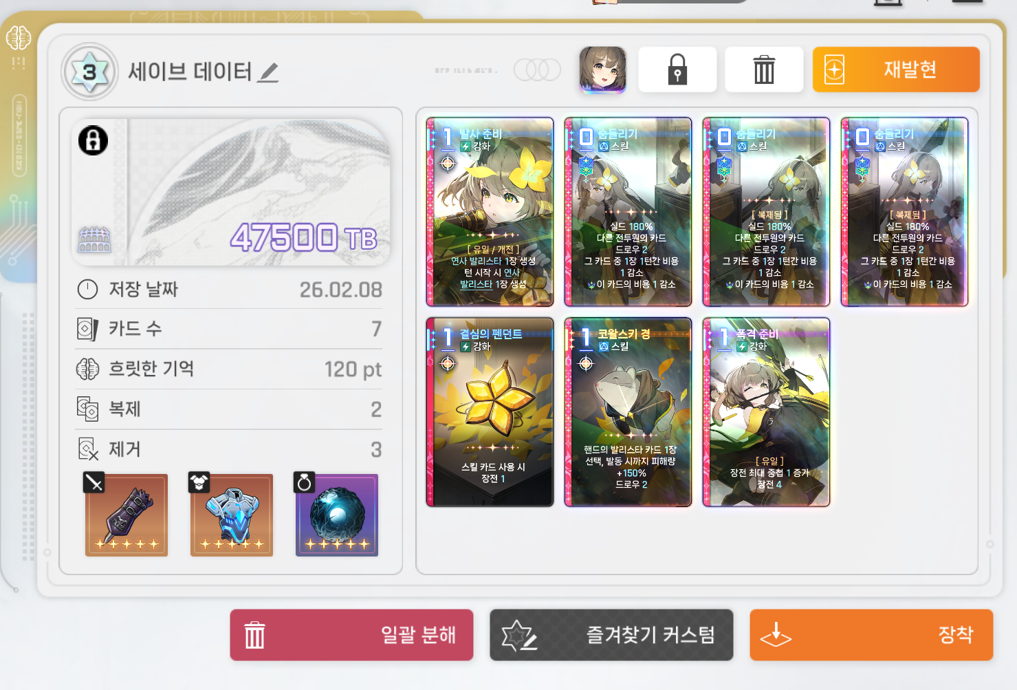 글상세자유 게시판 하 ㅠ 베로니카 졸업 직전이었는데 ㅠ [11] 코리안김치피자 2026-02-08 14:36 2026-02-08 23:36 (+09:00) view count 200 MY홈 보기 작성글 보기 신고하기 공유하기 14티어 카오스였는데 딱 10 부족해서 숨돌리기 1장을 복사 못함..하... 댓글 11 alarm 알림이 해제되었습니다. 최신순 최신순 등록순 추천순 댓글을 입력하려면 로그인 해주세요. 190954681 2026-02-10 18:59 2026-02-11 03:59 (+09:00) MY홈 보기 작성글 보기 신고하기 오조다 2026-02-08 14:54 2026-02-08 23:54 (+09:00) MY홈 보기 작성글 보기 신고하기 요새 코덱스 신화까지 뚤려서 그런것만 도세요 그게 재미있어요 신고하기 엇 그거 어케하는거죠?저 그냥 시즌 카오스밖에 할줄몰라서 신고하기 코리안김치피자시즌카오스도 15티어가 나오긴 하는데요 나이트 하면 16이구요 제로카오스에서 코덱스로 신화 돌리면 더좋아요 세이브데이터 베로니카 같은거 만들려면 그게 훨씬 쉬울겁니다 신고하기 코리안김치피자 신고하기 오조다 신고하기 코리안김치피자이것도 시즌카오스로 쳐주니 소멸전용 필요한게 아니면 이렇게 만드세요 더보기 확인 취소 확인