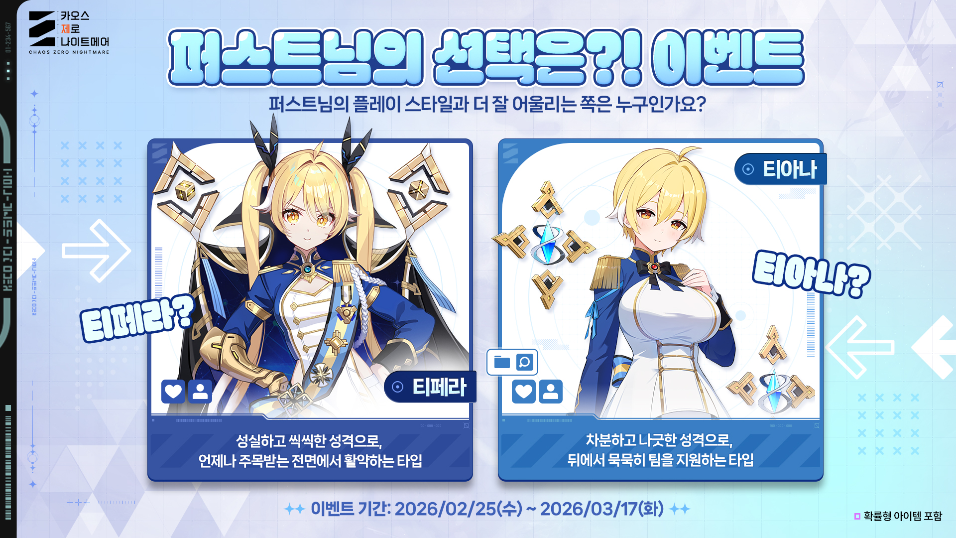 ✅ 이벤트 참여 방법: 티페라와 티아나 중 한 명을 골라 [UID/티페라 또는 티아나] 양식에 맞게 댓글을 남기면 참여 완료!