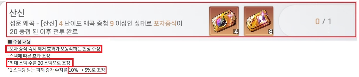 글상세제보/건의사항 산신 업적 클리어 난이도 조정 건의 드립니다 [1] 강규희 2026-03-01 20:17 2026-03-02 05:17 (+09:00) view count 58 MY홈 보기 작성글 보기 신고하기 공유하기 시즌2가 업데이트 된 이후 포자 증식 성능 조정패치가 크게 있었는데요 1. 패치 이전 포자 증식 효과를 다단히트 스킬로 공격 시 다단히트 끝까지 데미지 증가가 적용되던게 이제 첫타만 적용되게 바뀌면서 극소수의 캐릭터 이외에는 포자 효과를 받을수 없는 상태가 됨 2. 스택 최대치가 생김 3.받는 피해 증가 수치가 반토막남하지만 산신 업적 클리어 조건은 그대로라는 겁니다그래서 포자 증식 성능 조정 패치 이전에는 적당한 난이도였는데, 지금은 클리어 난이도가 정말로 상당히 높아요어느정도 조정해주시는게 좋아보여서 건의 드립니다 댓글 1 alarm 알림이 해제되었습니다. 최신순 최신순 등록순 추천순 댓글을 입력하려면 로그인 해주세요. 70128707 2026-03-02 14:27 2026-03-02 23:27 (+09:00) MY홈 보기 작성글 보기 신고하기 진짜 필요합니다 이거 때문에 모든 업적 보상클리어 보상(찬란한 업화의씨앗)을 못받습니다 확인 취소 확인