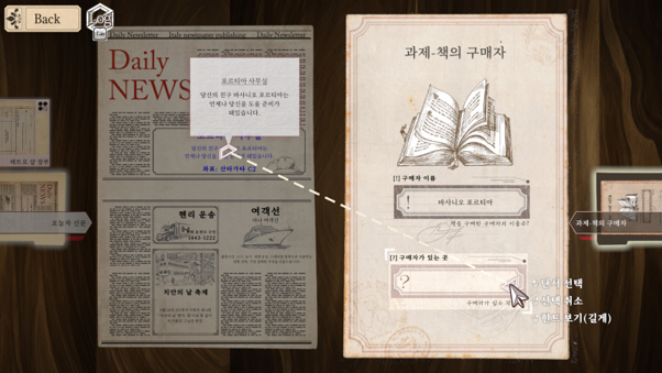 나이로 ㅣ 인터페이스에 신경을 많이 썼어요. 추리에 있어서 기존의 시스템을 유지하면서 기존에 불편했던 조작을 없애는 방향으로 만들었습니다. 추리 시스템 자체가 [스테퍼 케이스]와 엄청나게 다르진 않아요.