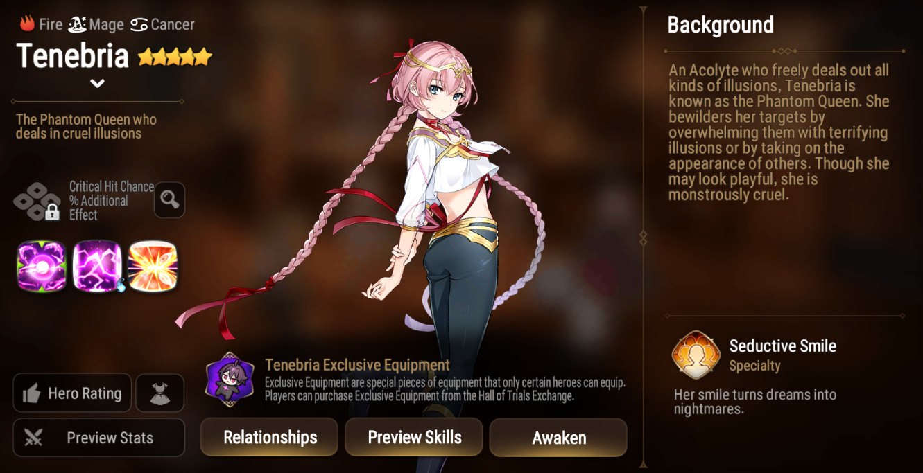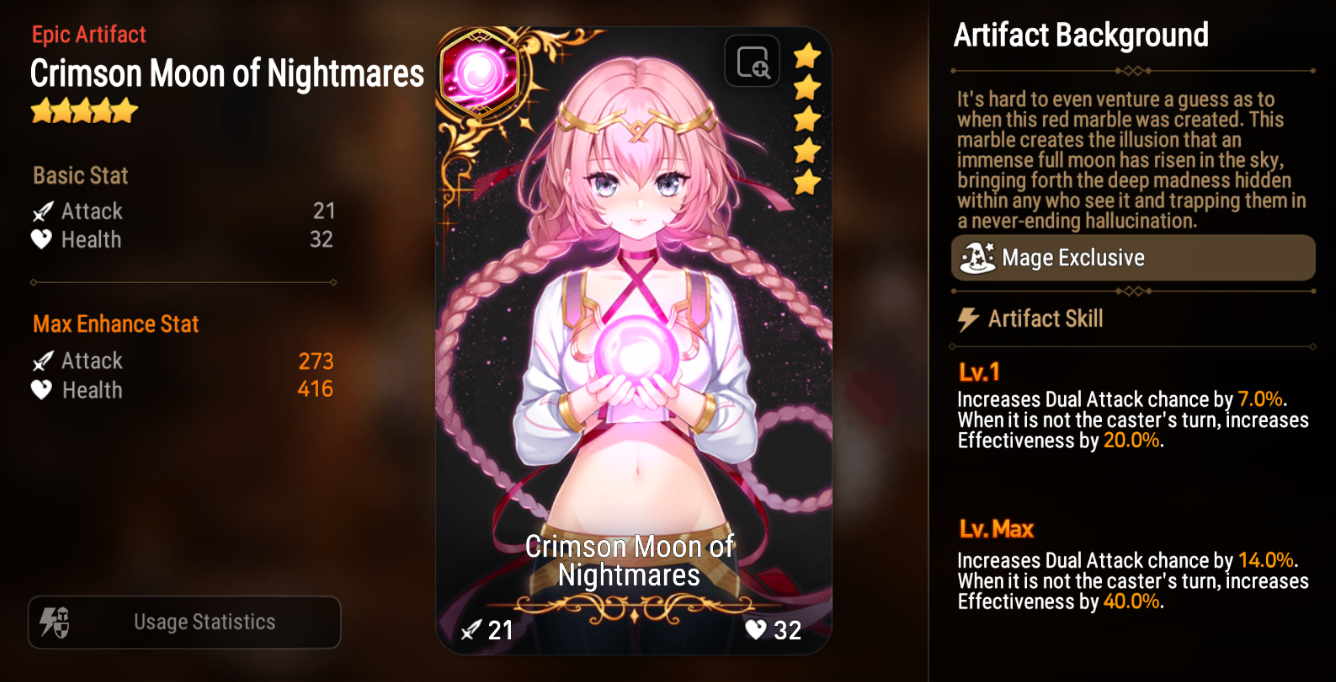 In this Drop Rate Up, meet Tenebria, a Fire elemental Mage proficient at generating countless variables in battle with her powerful debuffs. Players can also obtain the Mage exclusive Artifact, Crimson Moon of Nightmares, which increases the chance of Dual Attacks.