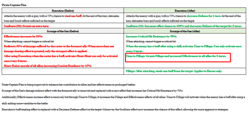 Pirate Captain Flan will be adjusted to enhance synergy and survivability.