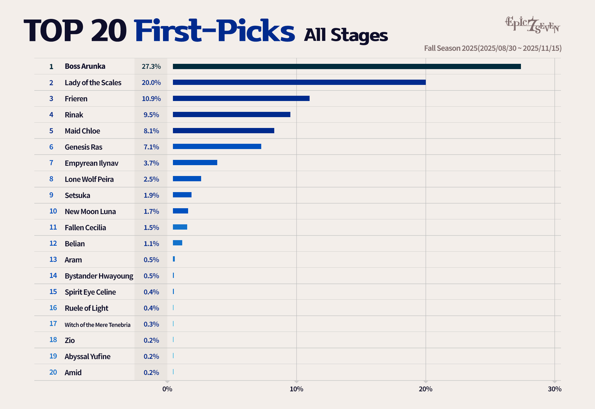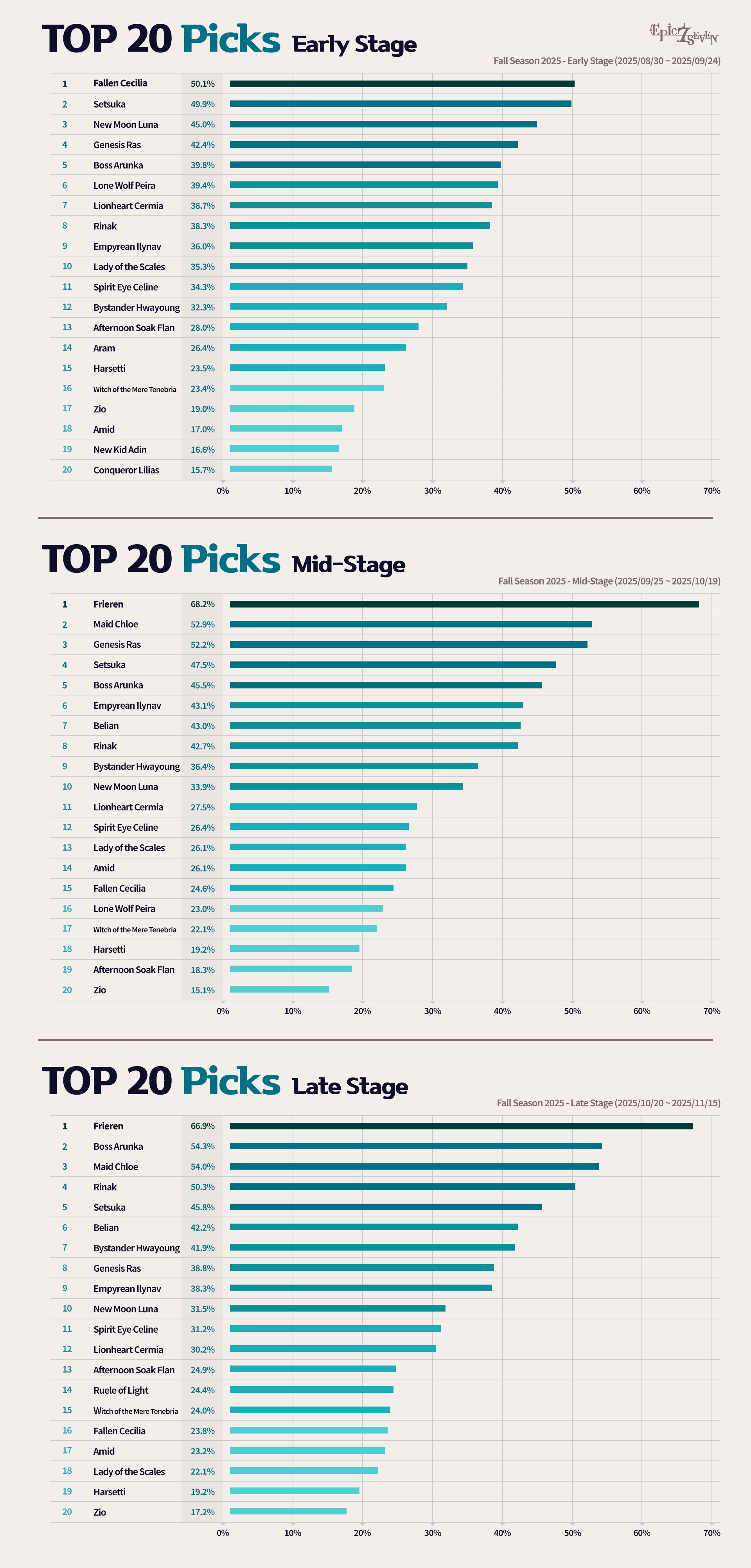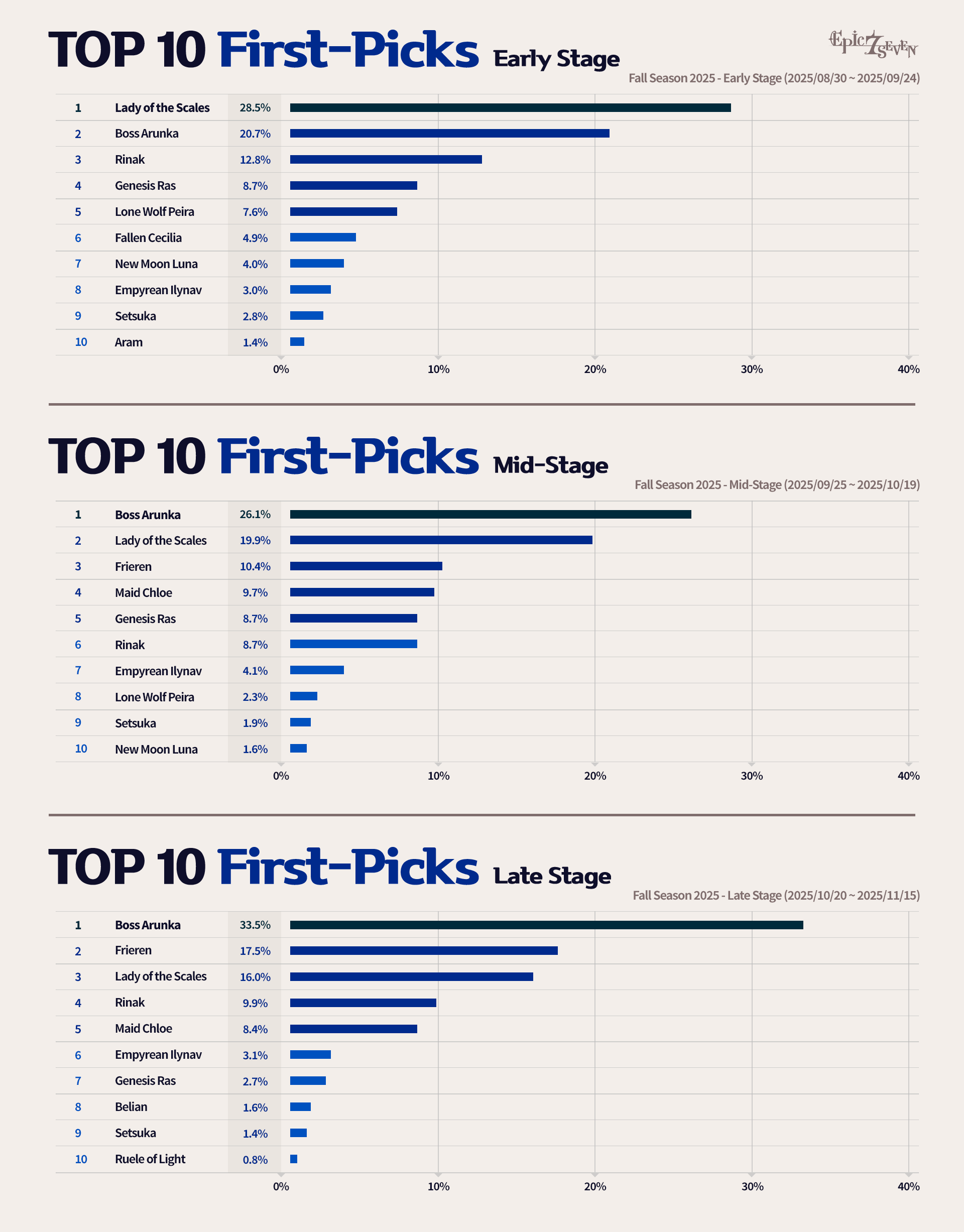 * Based on the Fall 2025 Season, you can view the first pick data for Champion league and above matches, divided into the entire season as well as early, mid, and late stages.
