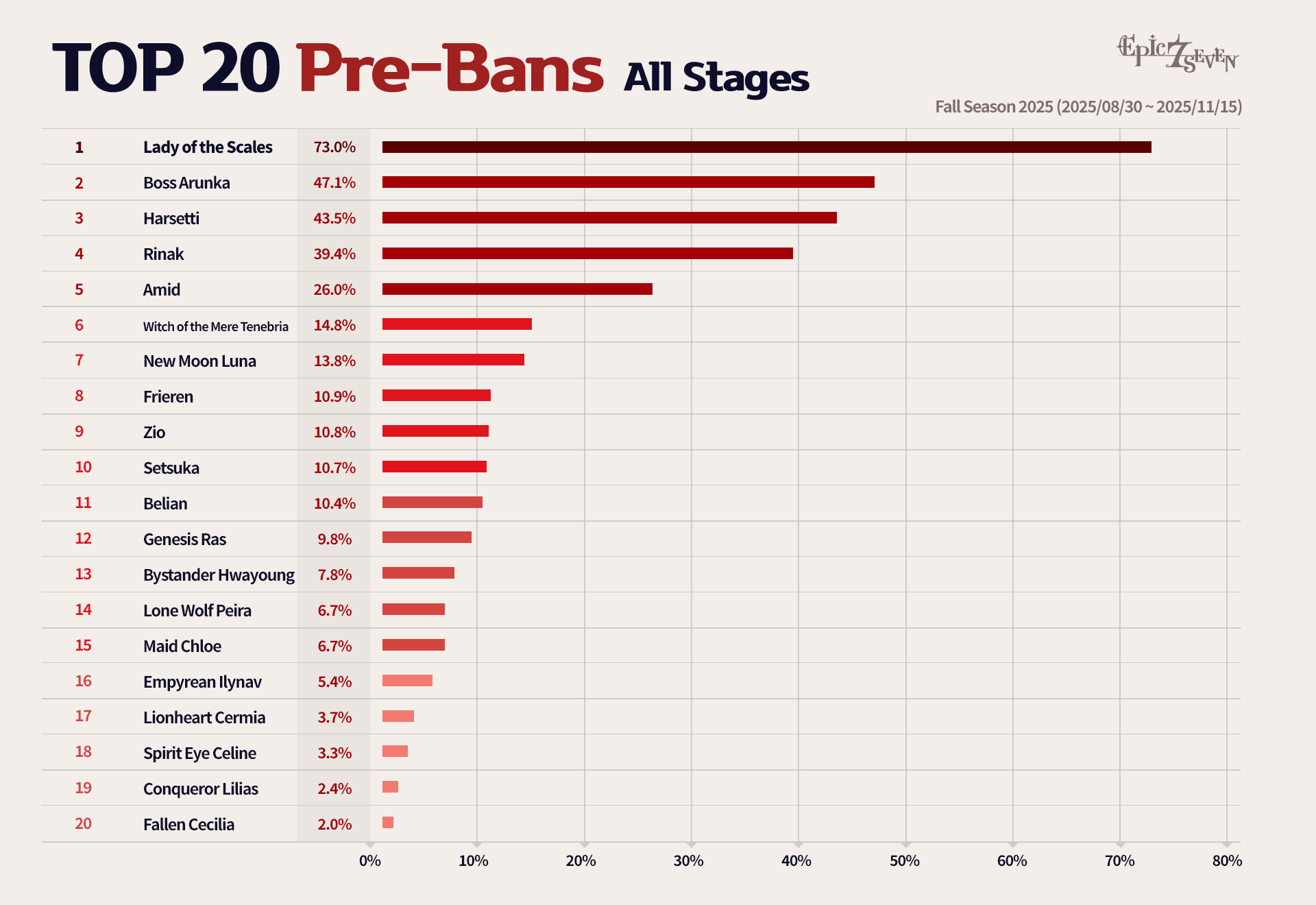 Looking back to the beginning of the season, two new Heroes—Lady of the Scales and Genesis Ras—quickly took center stage after their release and shaped the meta. Together with Setsuka, released in September, these Heroes exerted dominant influence throughout the entire season. In addition, Heroes who were central to the Pre-Season Balance Adjustments—such as Conqueror Lilias, Lionheart Cermia, and Festive Eda—continued to demonstrate strong presence.