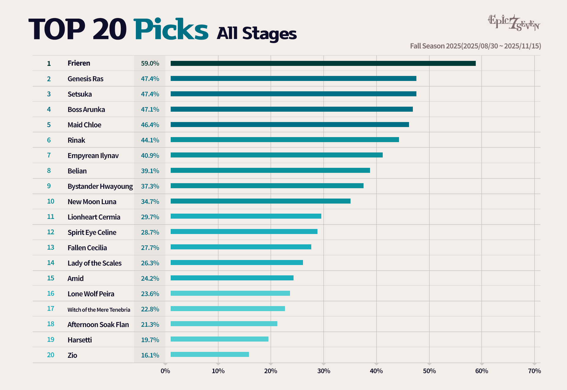 Around the midpoint of the season, the meta underwent another major shift. Maid Chloe, strengthened through the September Balance Adjustments, and Ruele of Light, who received new Exclusive Equipment, ushered in a revival meta. Joining them at the front lines was the newly arrived crossover Hero, Frieren, who played a major role on the battlefield.