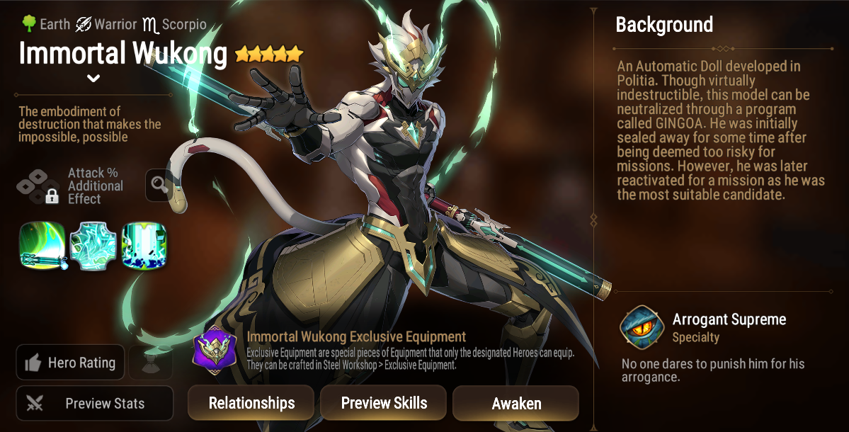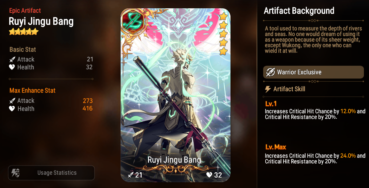 In this Drop Rate Up event, meet Immortal Wukong, an Earth elemental Warrior with high Critical Hit Resistance and Penetration Resistance, making him effective against Heroes that rely on critical hits and penetration attacks. Players can also obtain the Warrior-exclusive Artifact, Ruyi Jingu Bang, which increases Critical Hit Chance and Critical Hit Resistance.
