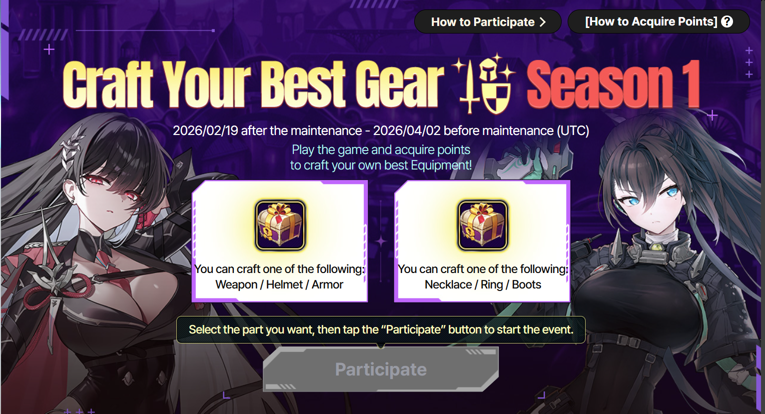 - (Added on 2/27) The “Craft Your Best Gear” Event Season 2 will be available to participate in after the maintenance on 3/12(Thu) and can be accessed until the end of the event period.