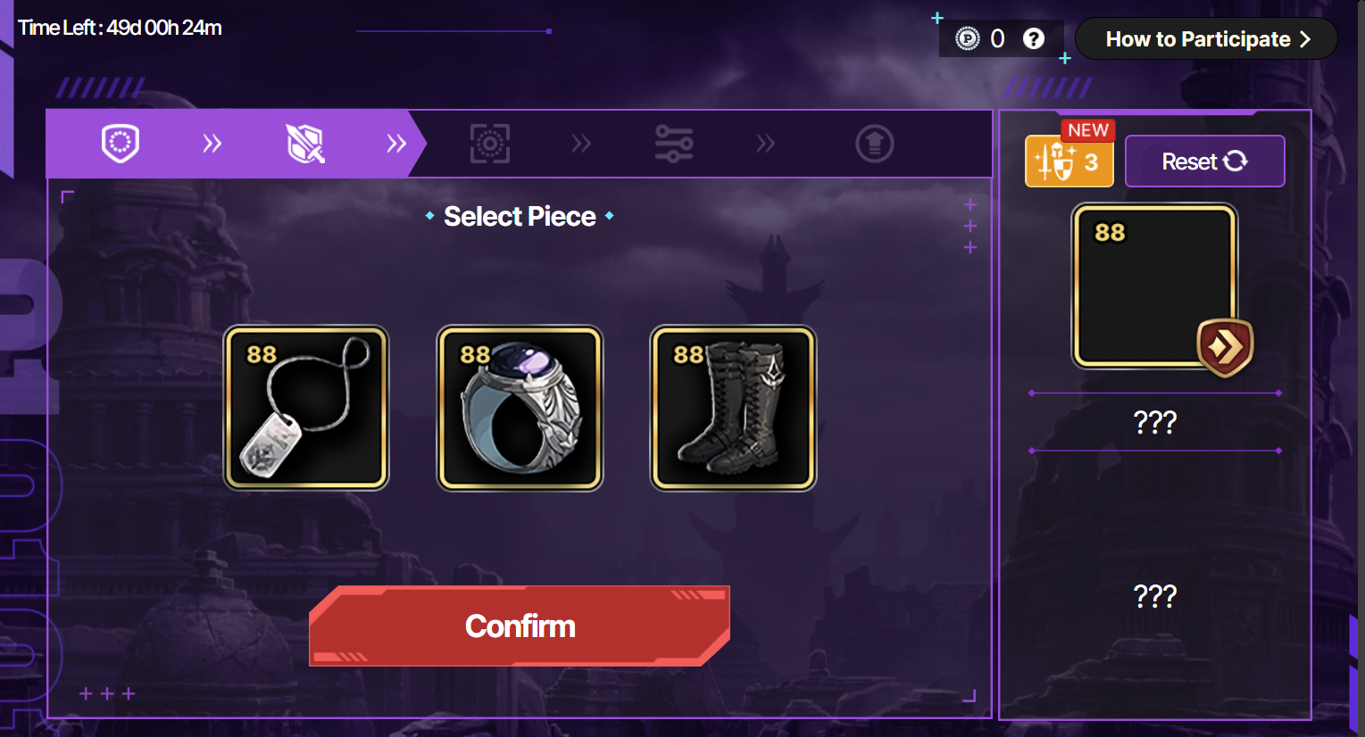 ※Note: You may interchange your selections between [Weapon], [Helmet], and [Armor] and [Necklace], [Ring], and [Boots] across Season 1 and Season 2. For example, you can select a Necklace in Season 1 and a Weapon in Season 2 or choose a Weapon in Season 1 and a Ring in Season 2.