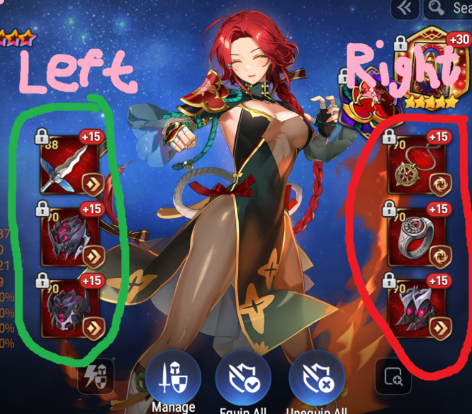 b) Left side gear all have FIXED main stats (sword = flat attack, helmet = flat health, chest = flat defense). Right-side gear does not have fixed stats and can be almost any stat in the game (with some rules).