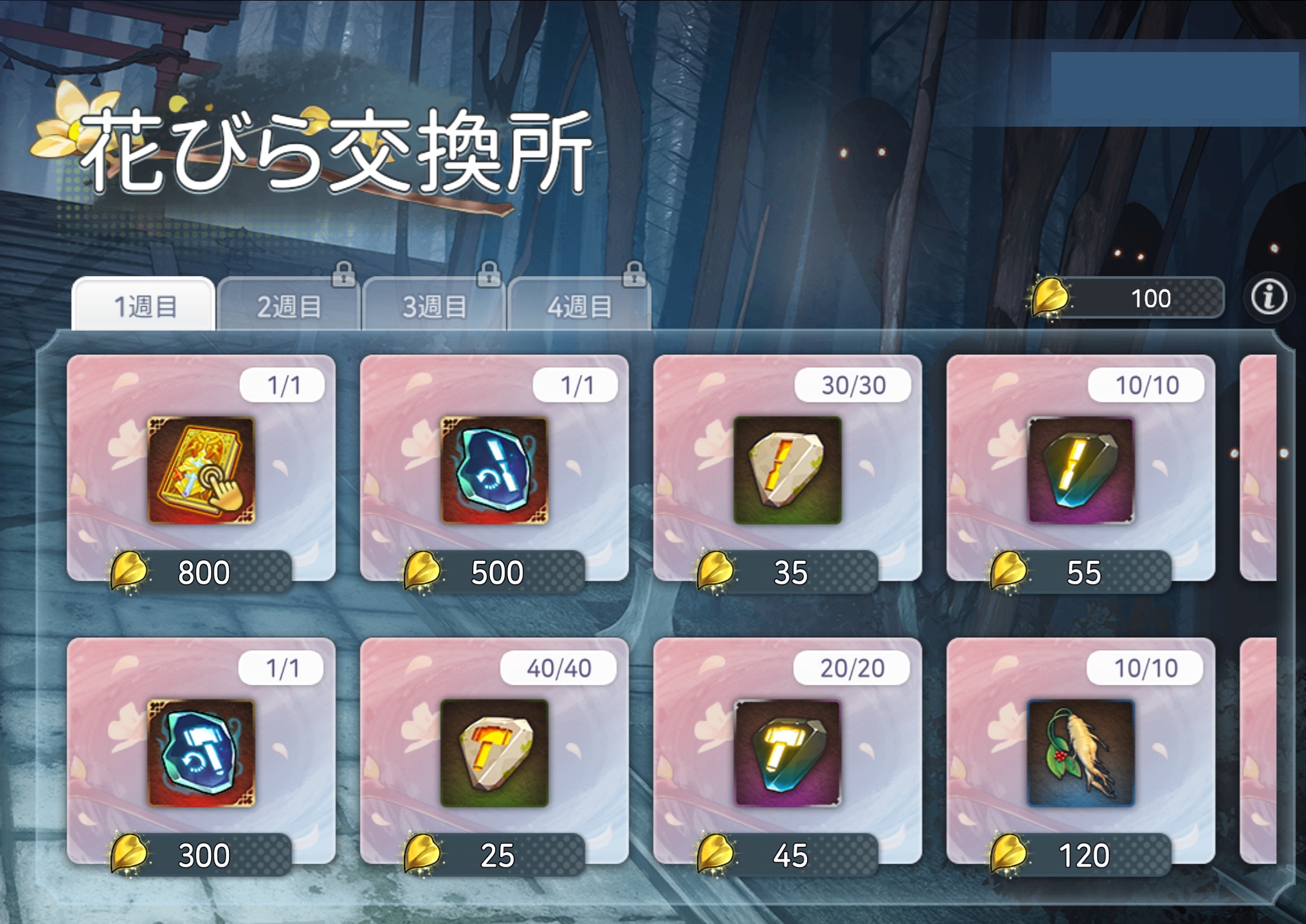 一週間ごとに解放される交換所で、獲得した霊妙な神木の花葉を好きなアイテムに交換できます。