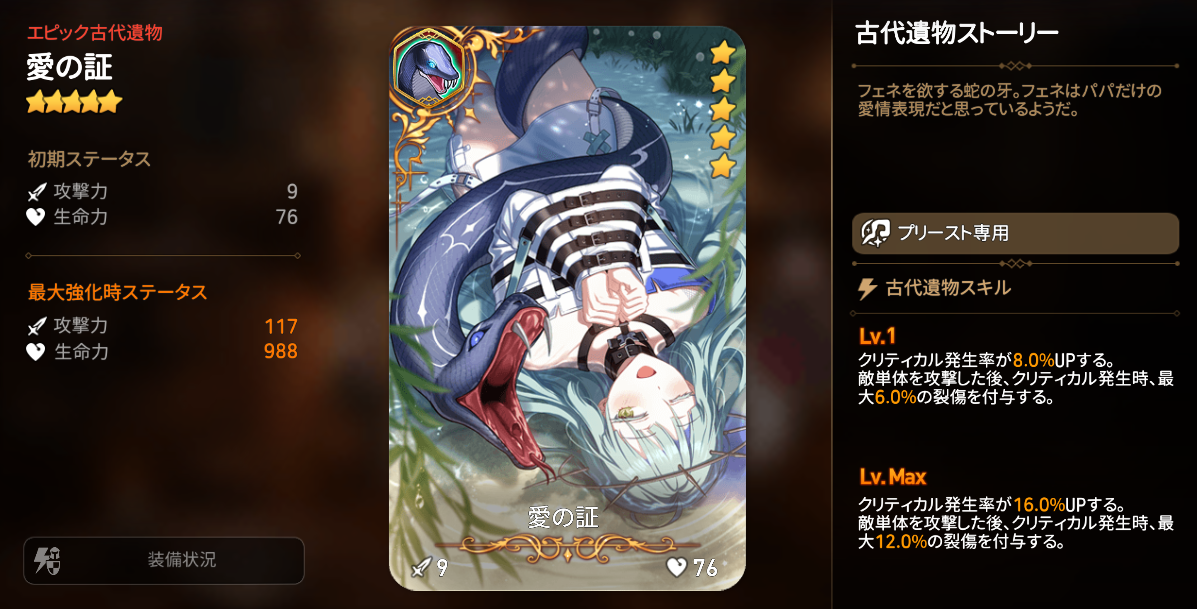 スキルを使用する時、自身の生命力を消費して自ら裂傷を付与し、自身の裂傷の最大生命力減少量に応じてダメージとステータスがUPする氷属性のプリースト【フェネ】と、クリティカル発生率をUPさせ、敵単体を攻撃した後、クリティカル発生時、与えたダメージの分、対象に裂傷を付与するプリースト専用の古代遺物【愛の証】がピックアップ召喚に登場します。