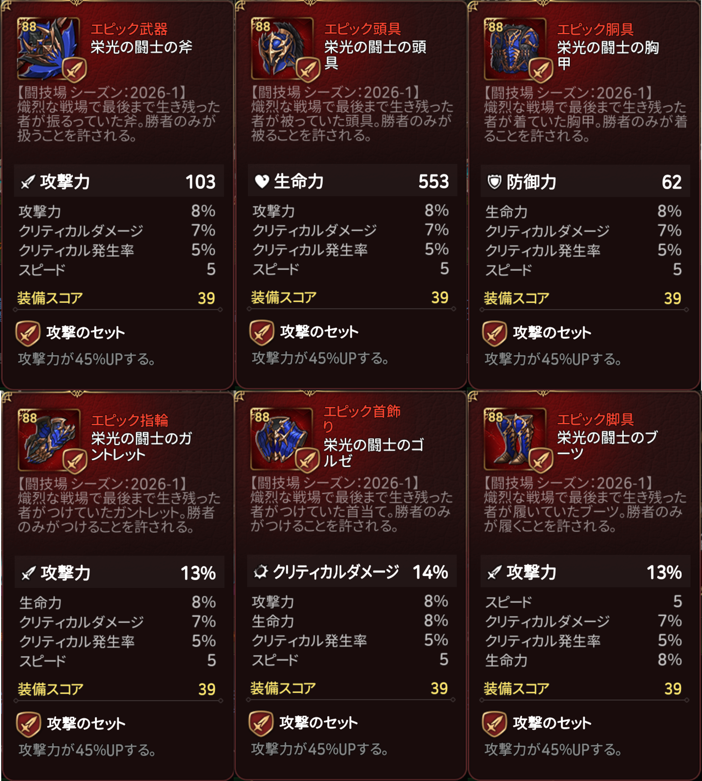 ・闘技場「シーズン:2026-1」の栄光の闘士装備は「固有ステータス/付属ステータス」の種類および初期値が、獲得時点から決定されています。