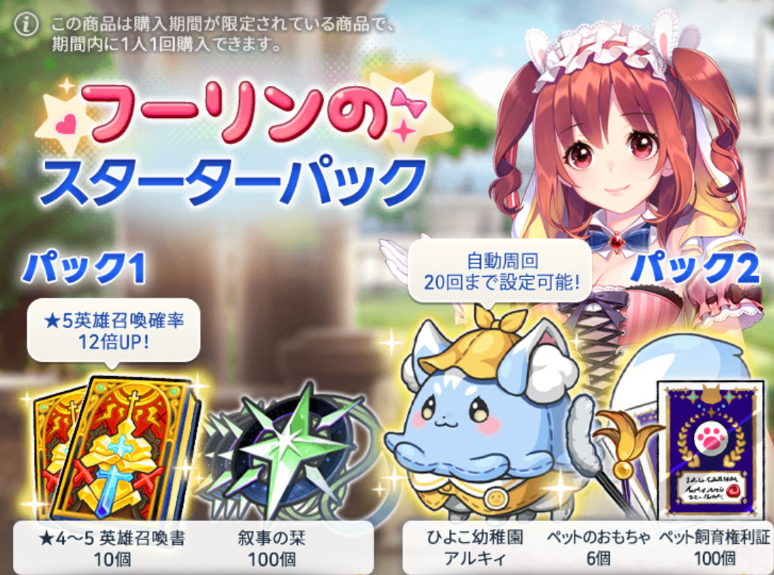 新規継承者の皆様に役立つ英雄召喚、ペット飼育財貨と自動周回回数を20回まで増やせるペット【ひよこ幼稚園アルキィ】を含む「フーリンのスターターパック」の販売が始まります。