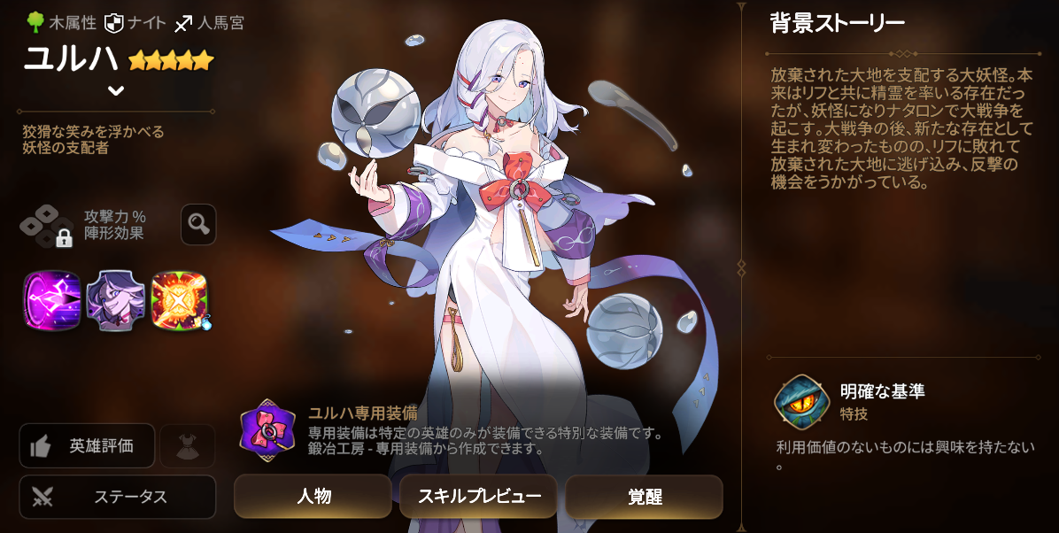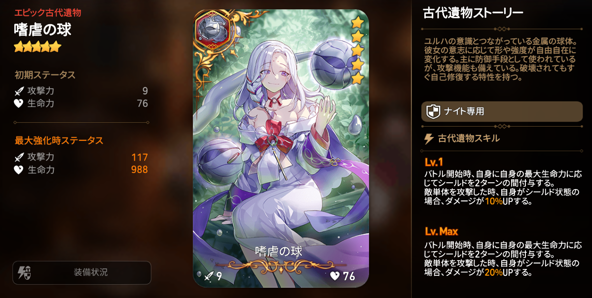 主に単体攻撃を行う敵に対して活躍できる能力を持つ木属性ナイト【ユルハ】と、バトル開始時に自身にシールドを付与し、敵に攻撃した時に自身がシールド状態ならダメージがUPするナイト専用の古代遺物【嗜虐の球】がピックアップ召喚に登場します。