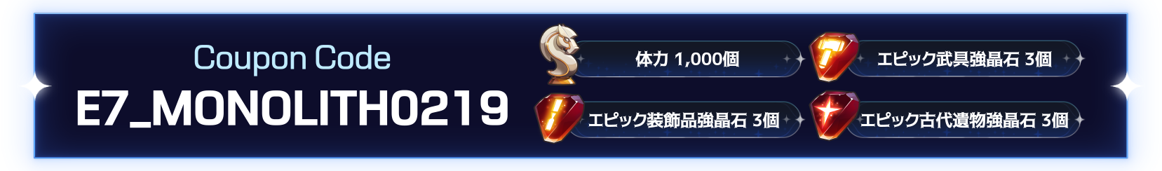 1.クーポン番号:E7_MONOLITH0219