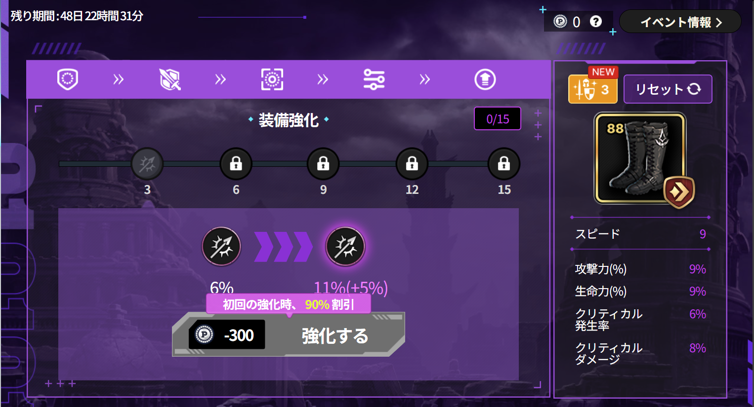 ・付属ステータスの強化には、初回の強化時だけ割引が適用され300ptを消費し、2回目以降は1回強化するたびに3,000ptを消費します。