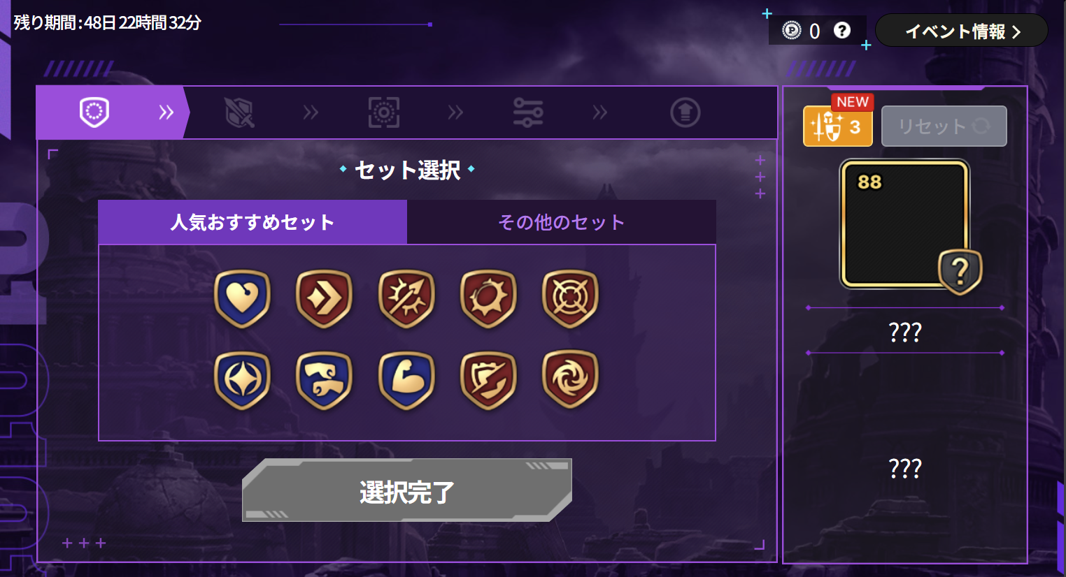 ・リセットには2,000ptが消費され、リセットするとセット選択からやり直すことができます。