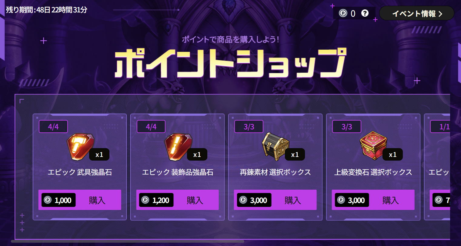 ・ポイントショップは「エピック装備を鍛えよう!」イベント終了から7日後までご利用いただけます。