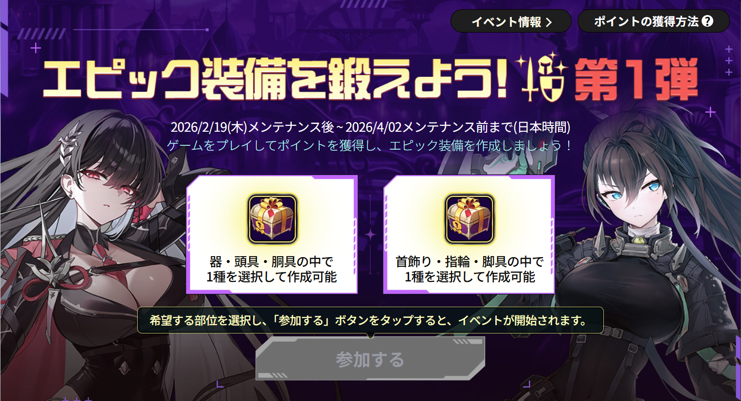 ・「エピック装備を鍛えよう!」イベント画面の【参加する】ボタンをタップした時点をイベント開始とし、この時点からポイントを獲得できるようになります。
