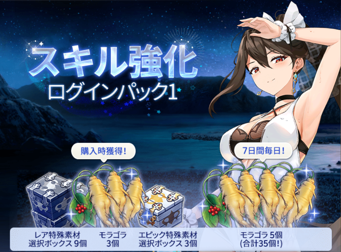 スキル強化ログインパック1 | モラゴラ(即時支給) | 3 | 1アカウントにつき1回 | アプリ内課金 |