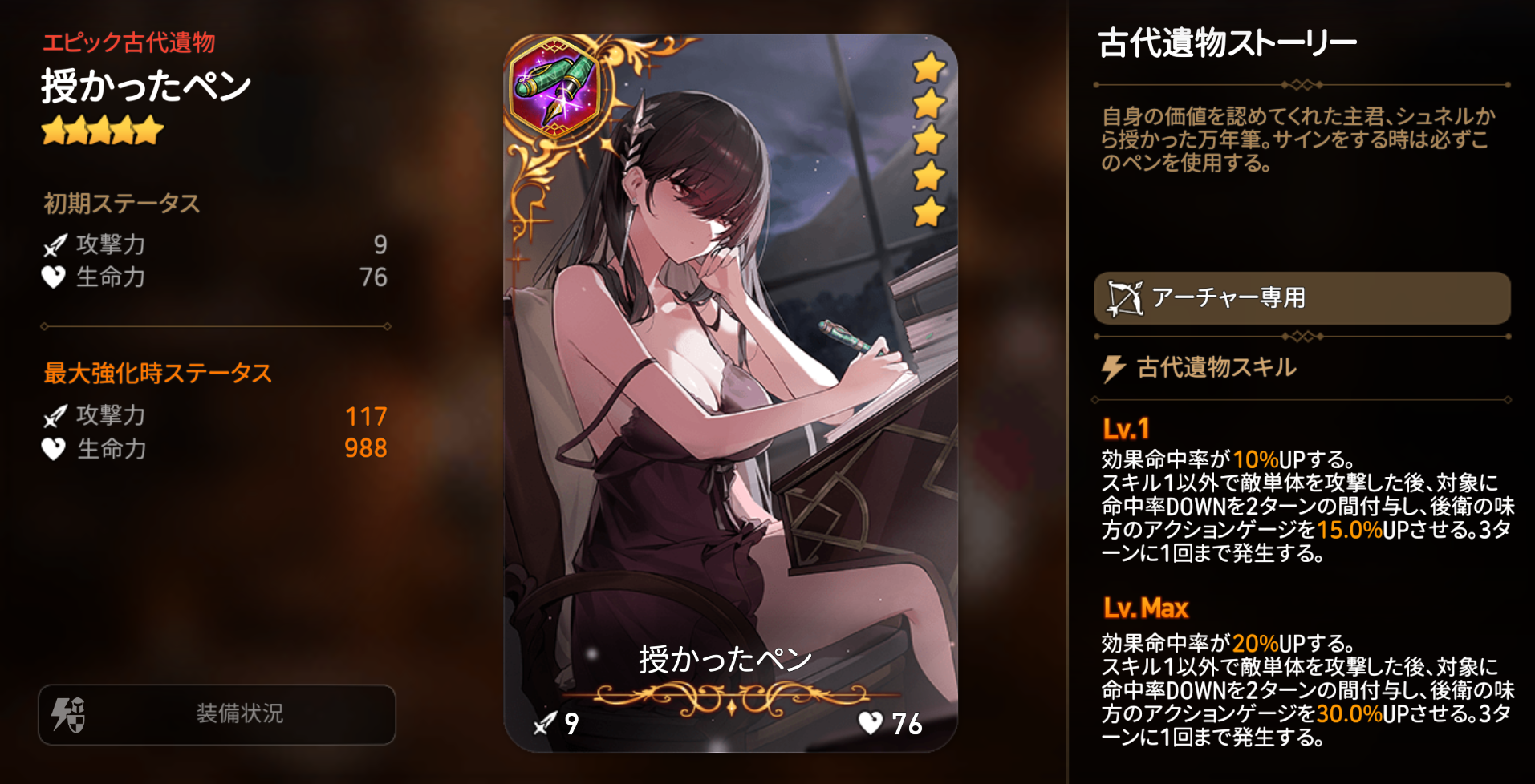 敵単体に強力な弱体効果を付与し、その弱体効果を敵全体に拡散させられる火属性のアーチャー「ルイザ」と、自身の効果命中率をUPさせ、スキル1以外のスキルで敵単体を攻撃した時、対象に命中率DOWNを付与し、後衛の味方のアクションゲージをUPさせるアーチャー専用の古代遺物【授かったペン】がピックアップ召喚に登場します。