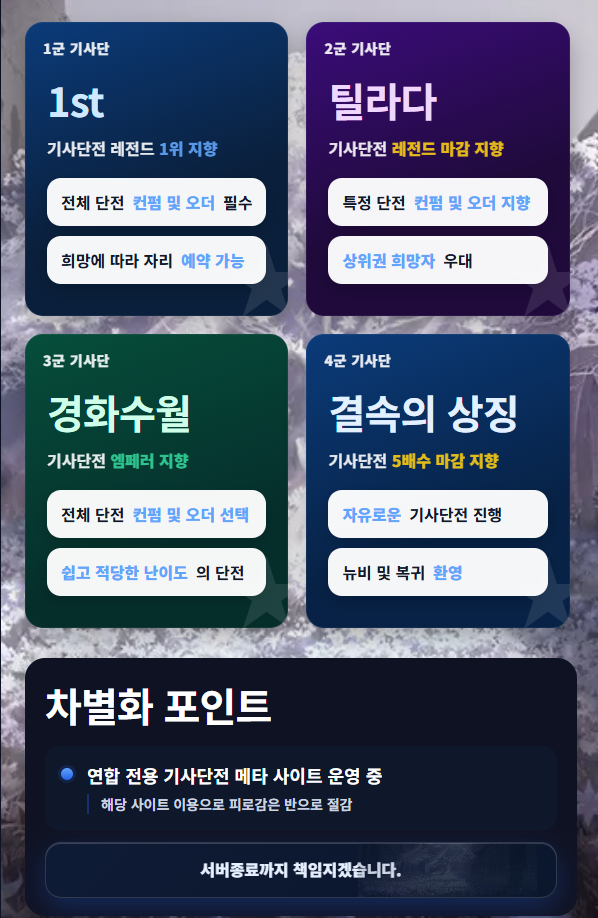 단순히 1등만 노리는 기사단이 아닌 다양한 계층과 성향의 단원분들 함께 성장해가는 연합을 목표로 하고 있습니다!
