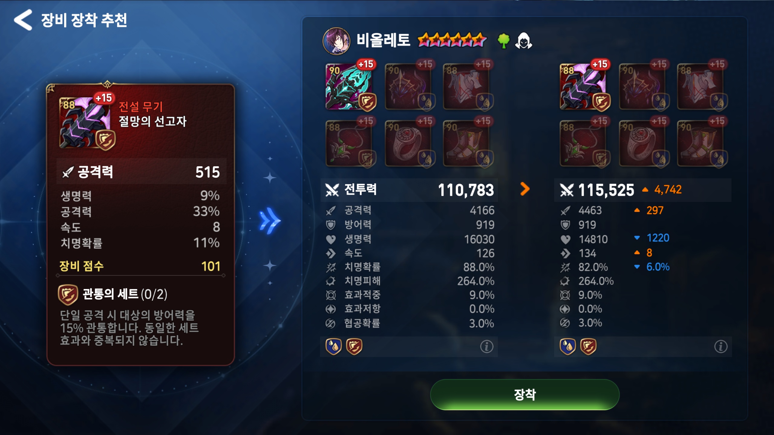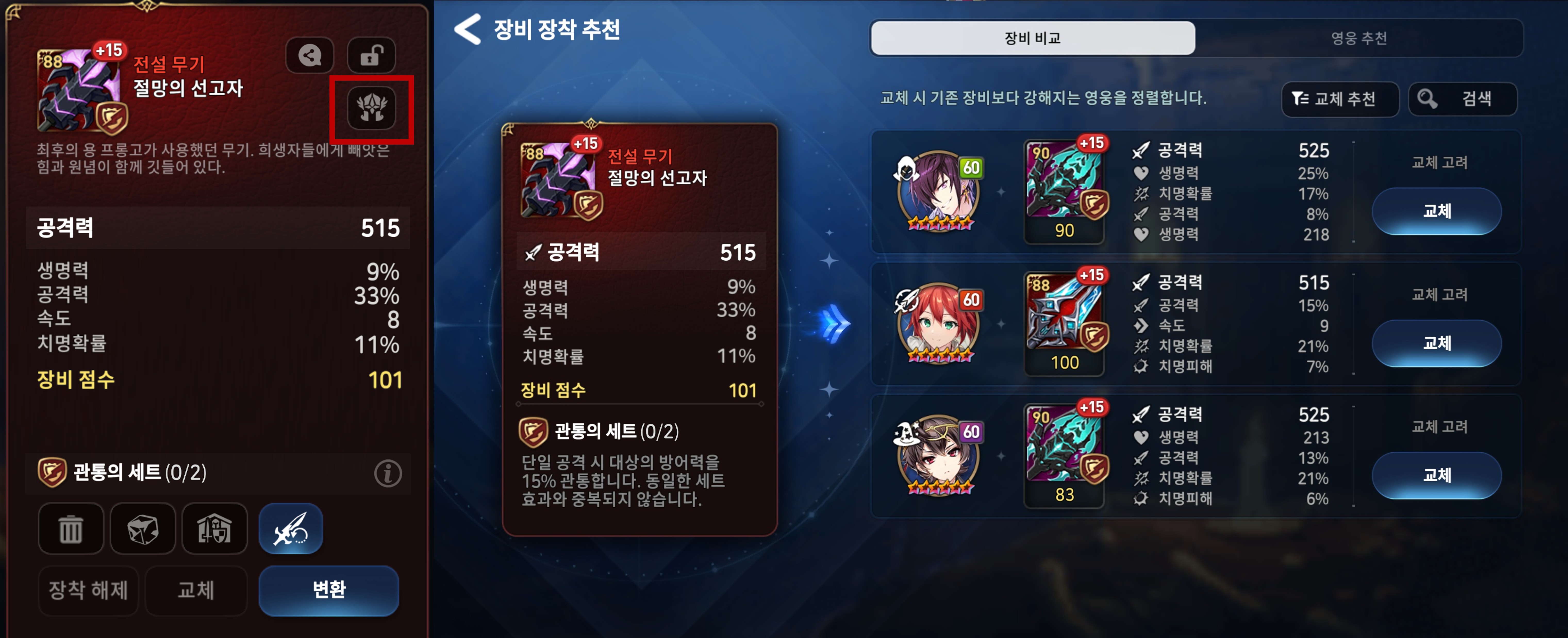 - 교체 버튼을 클릭하면 해당 장비 장착 시 변경되는 영웅 스탯을 확인하실 수 있습니다.