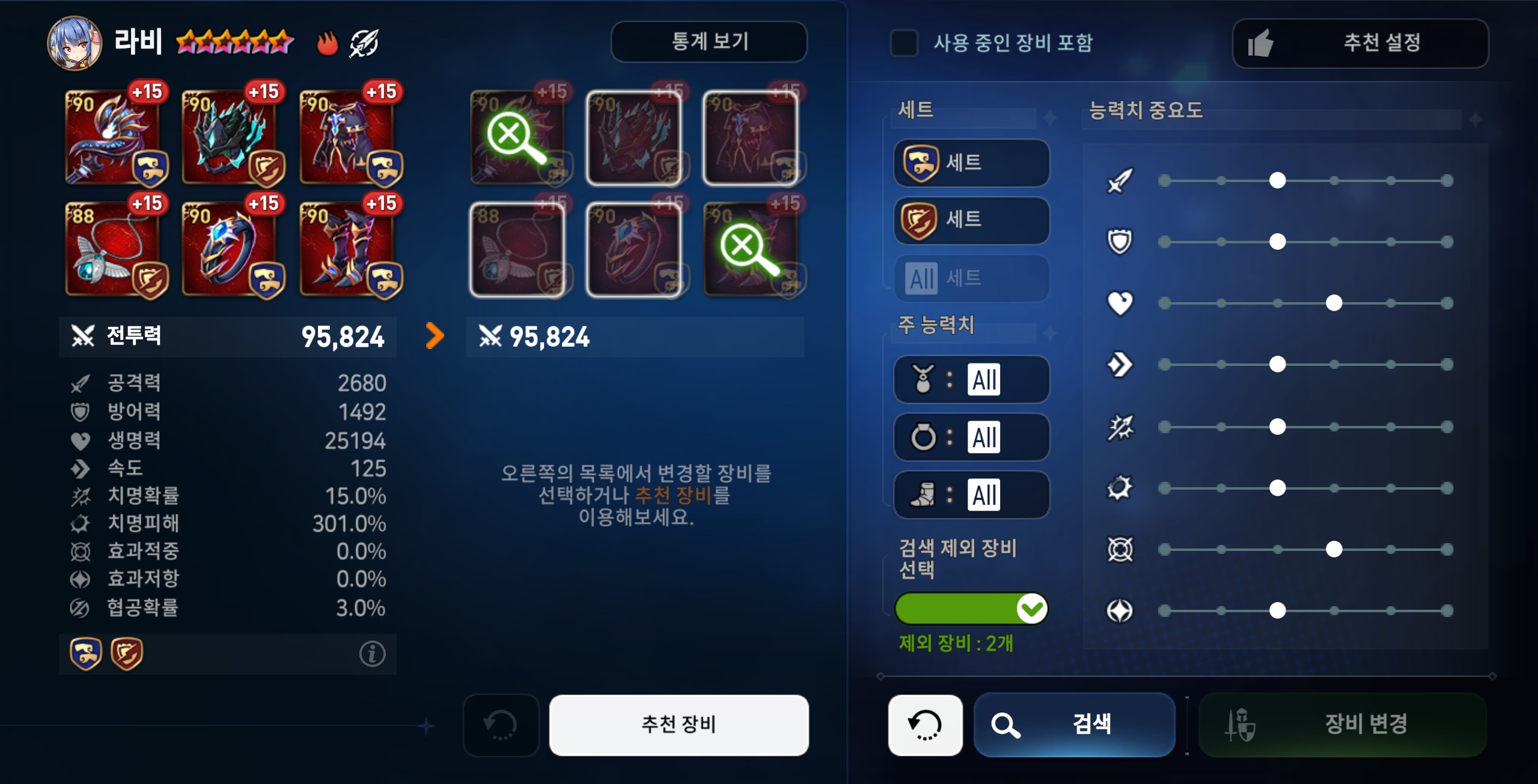 2. 능력치 하한 설정 ex) 치확 85 효적 85 105 100 효저 100 200 등 설정하고 자동 맞춤하는 기능